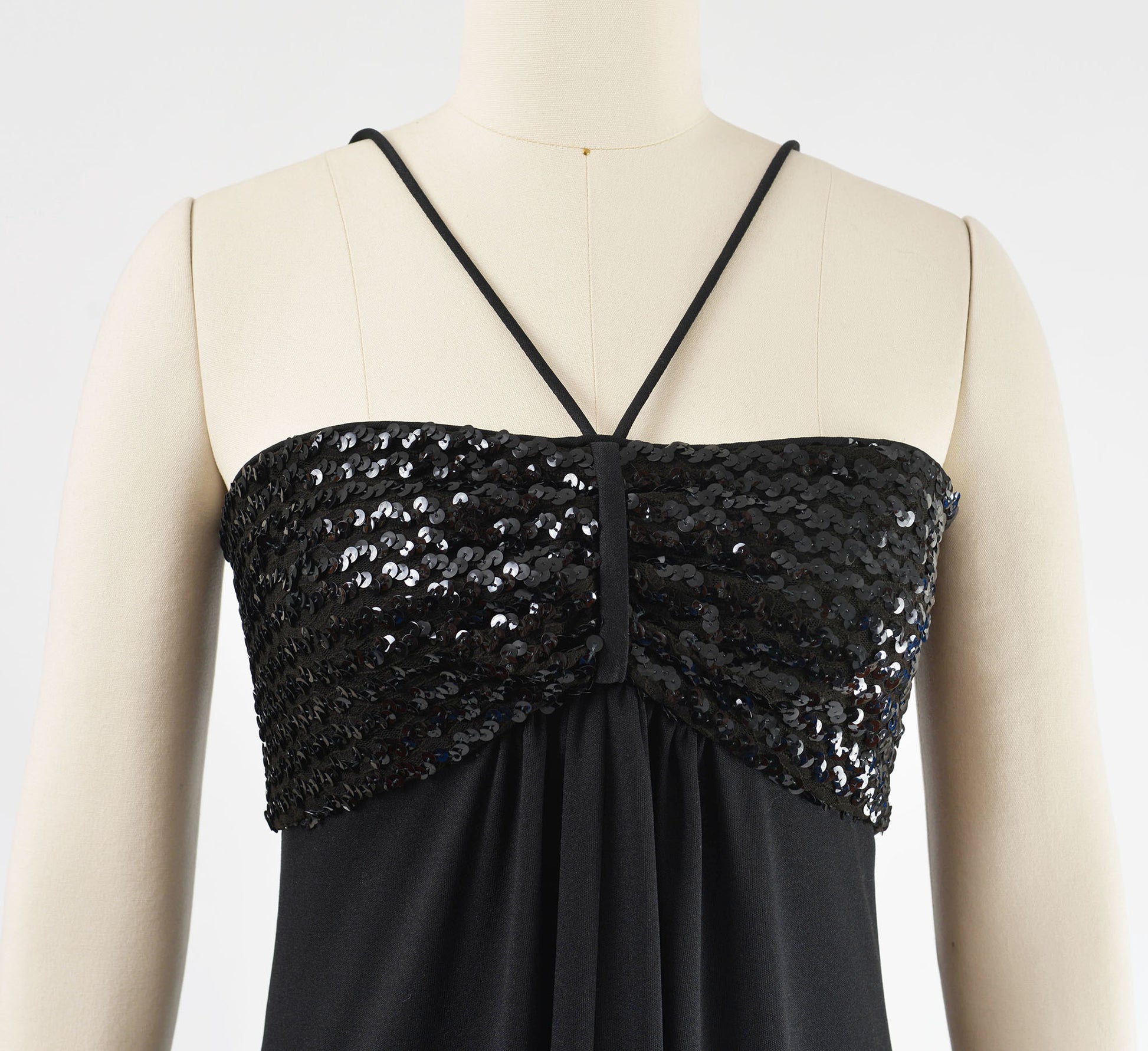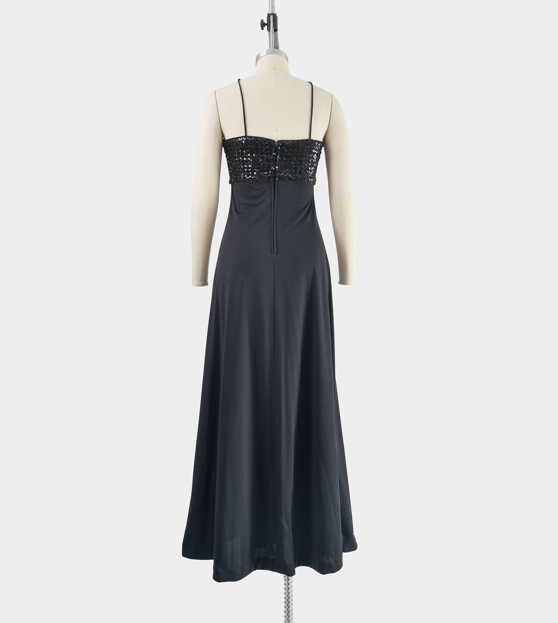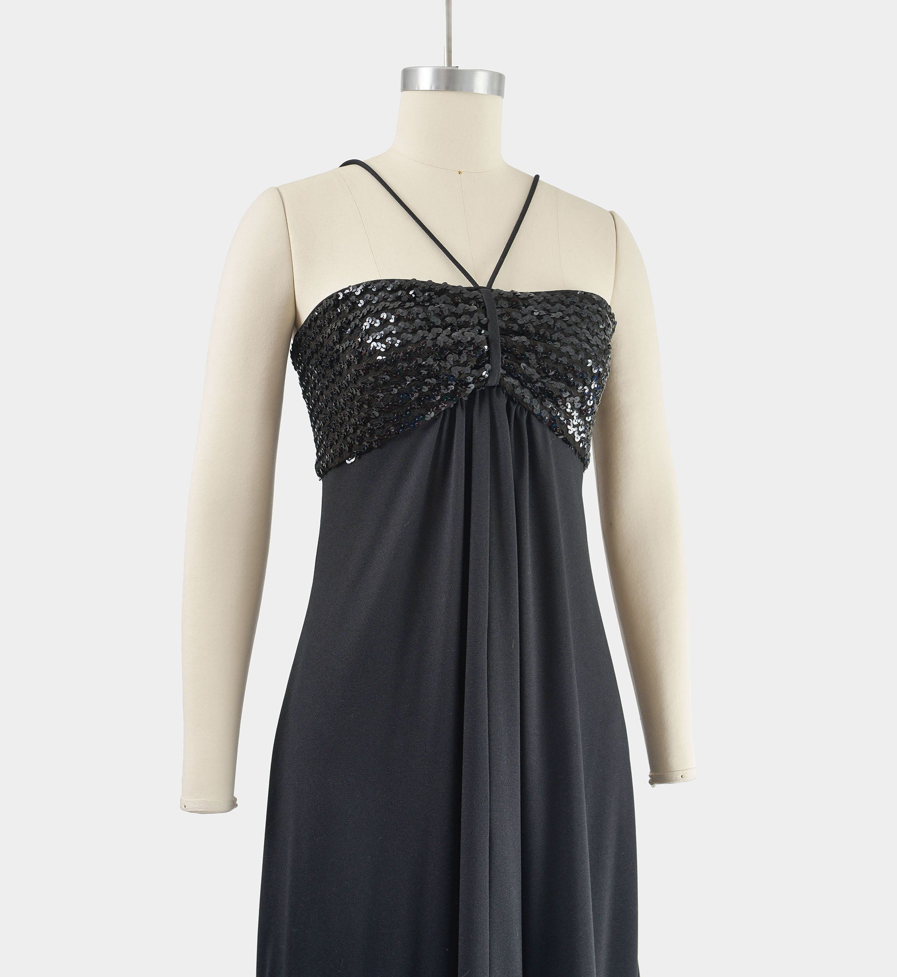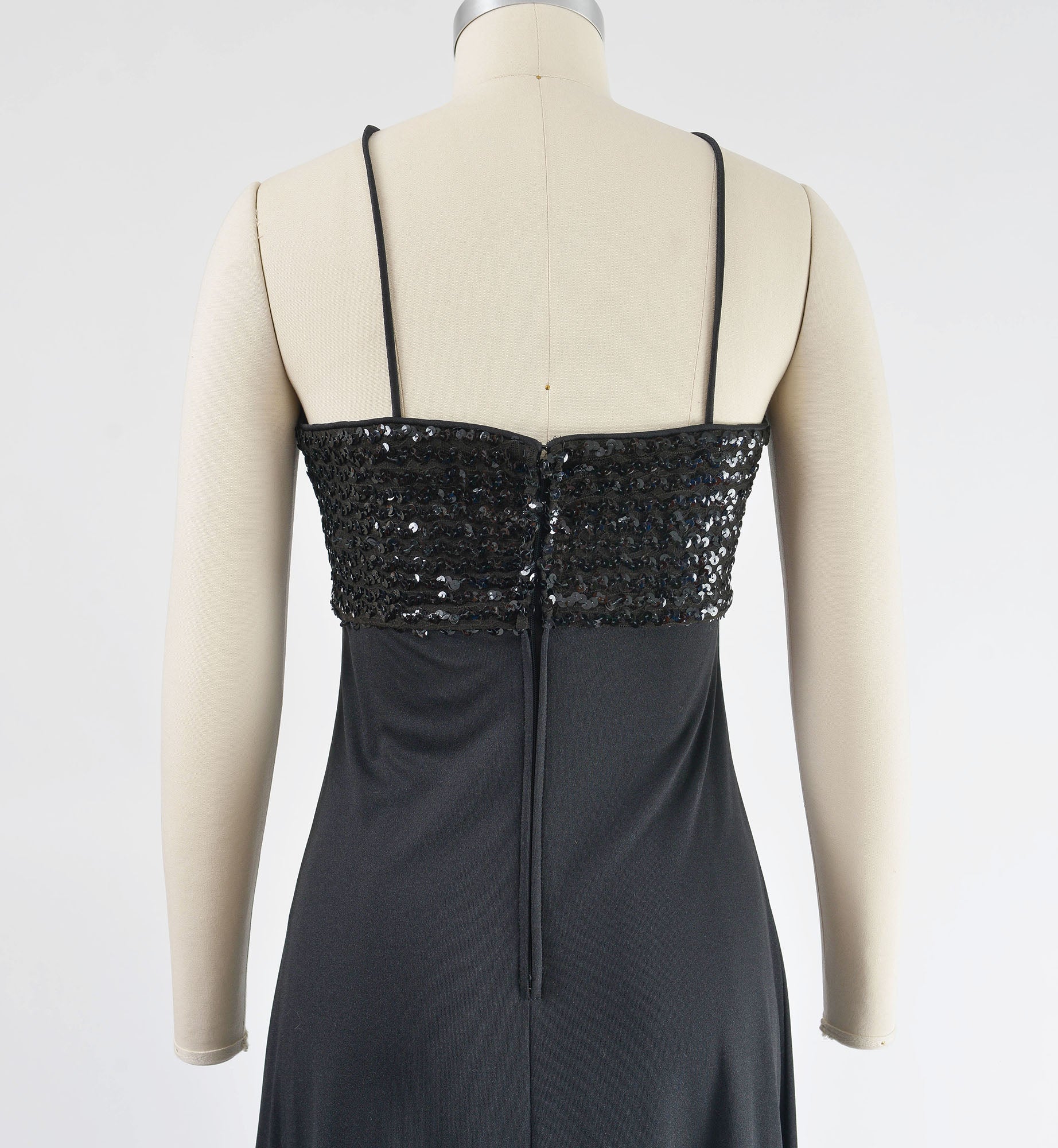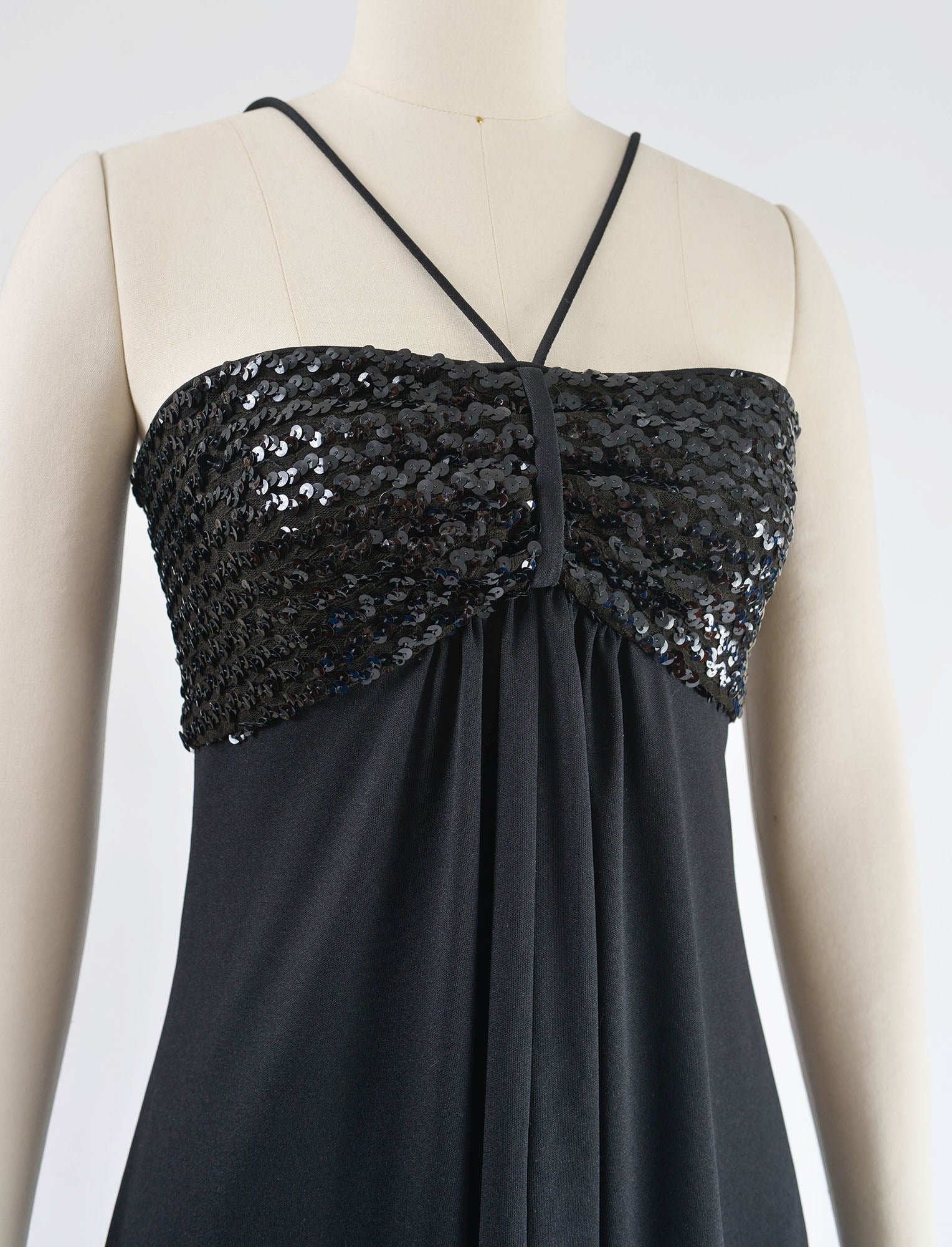 Vintage 1970's black knit dress. Empire waist. Sequin bodice. Cinch front with narrow straps. Draped front. Maxi length. Rear zipper.
