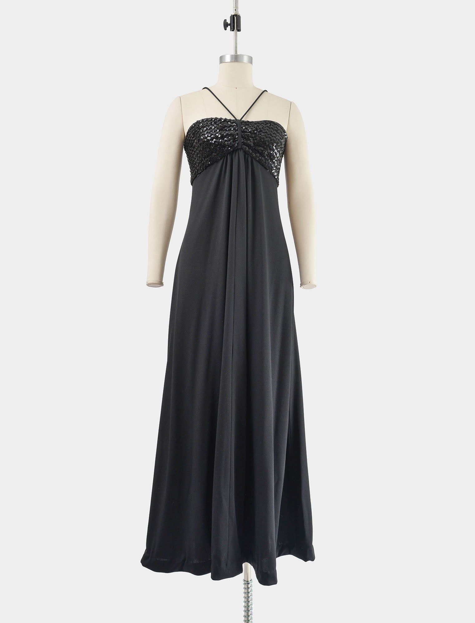 Vintage 70s Black Sequin Empire Waist Evening Disco Maxi Dress size XS