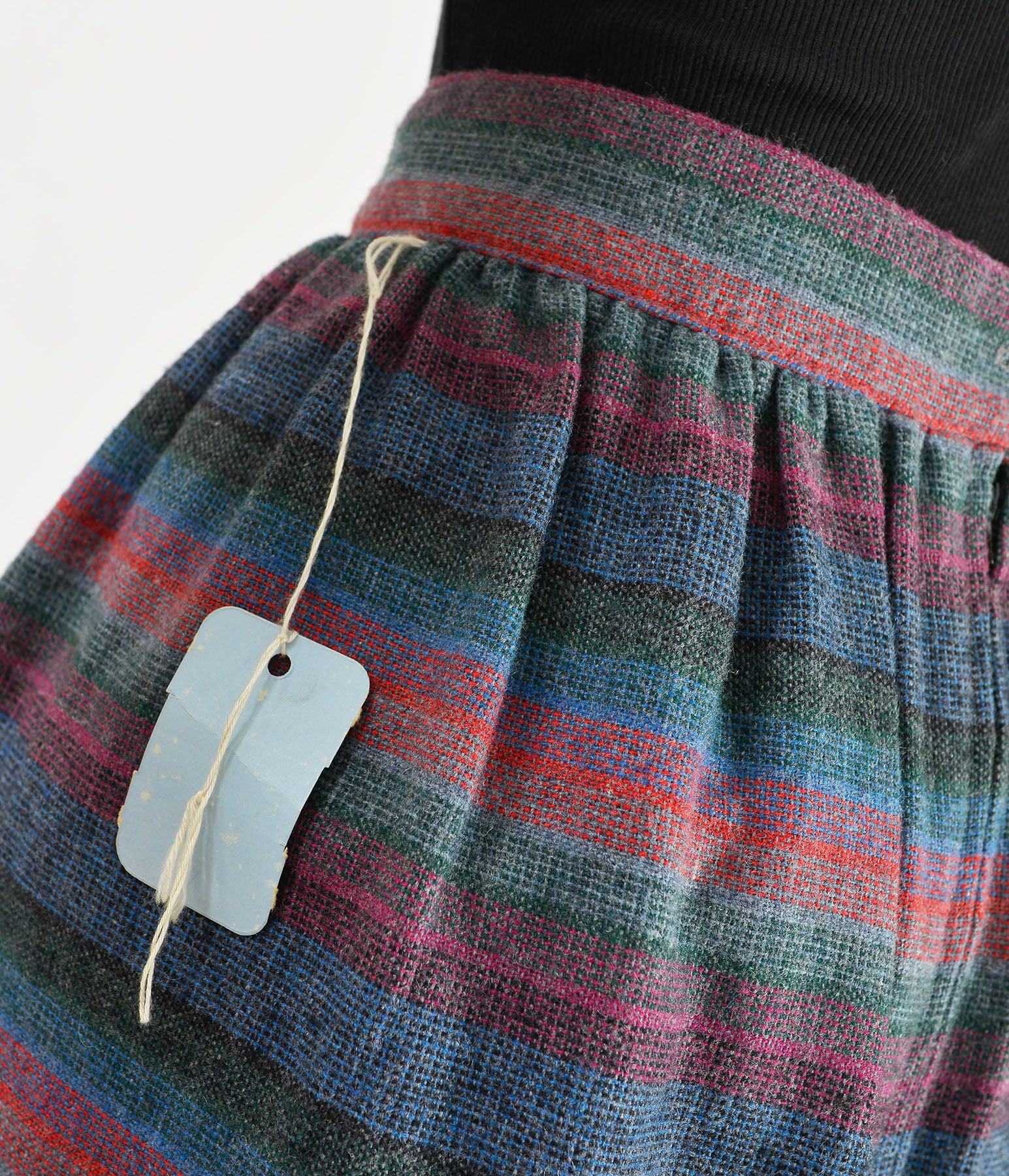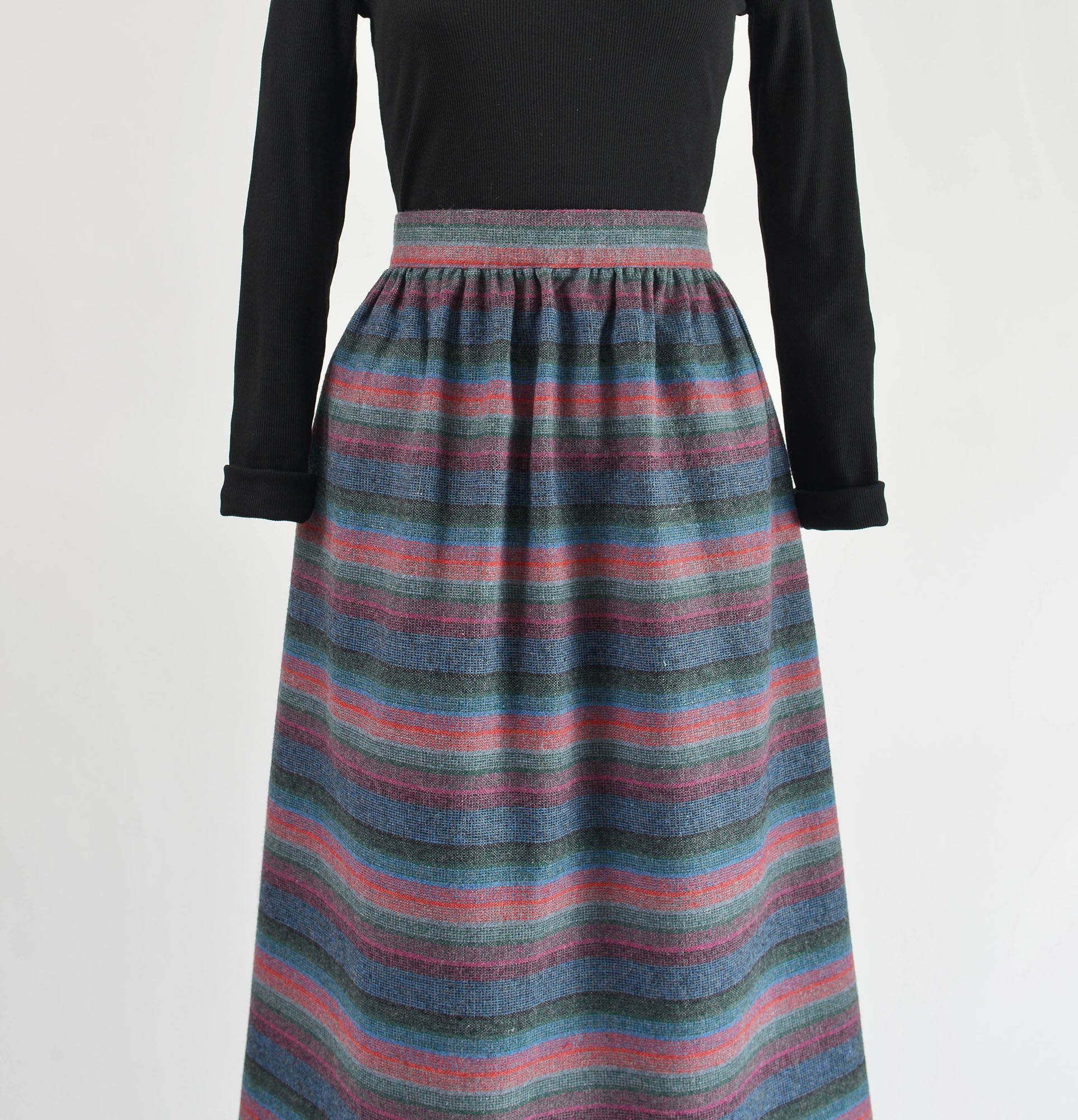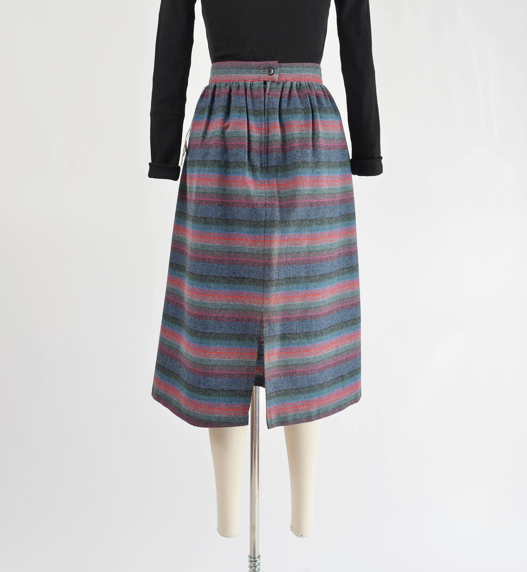 Vintage 1970's woven wool blend skirt. Multi-colored stripes. High waisted. Midi length. Zipper fly. Button waist. Unlined, but not scratchy.