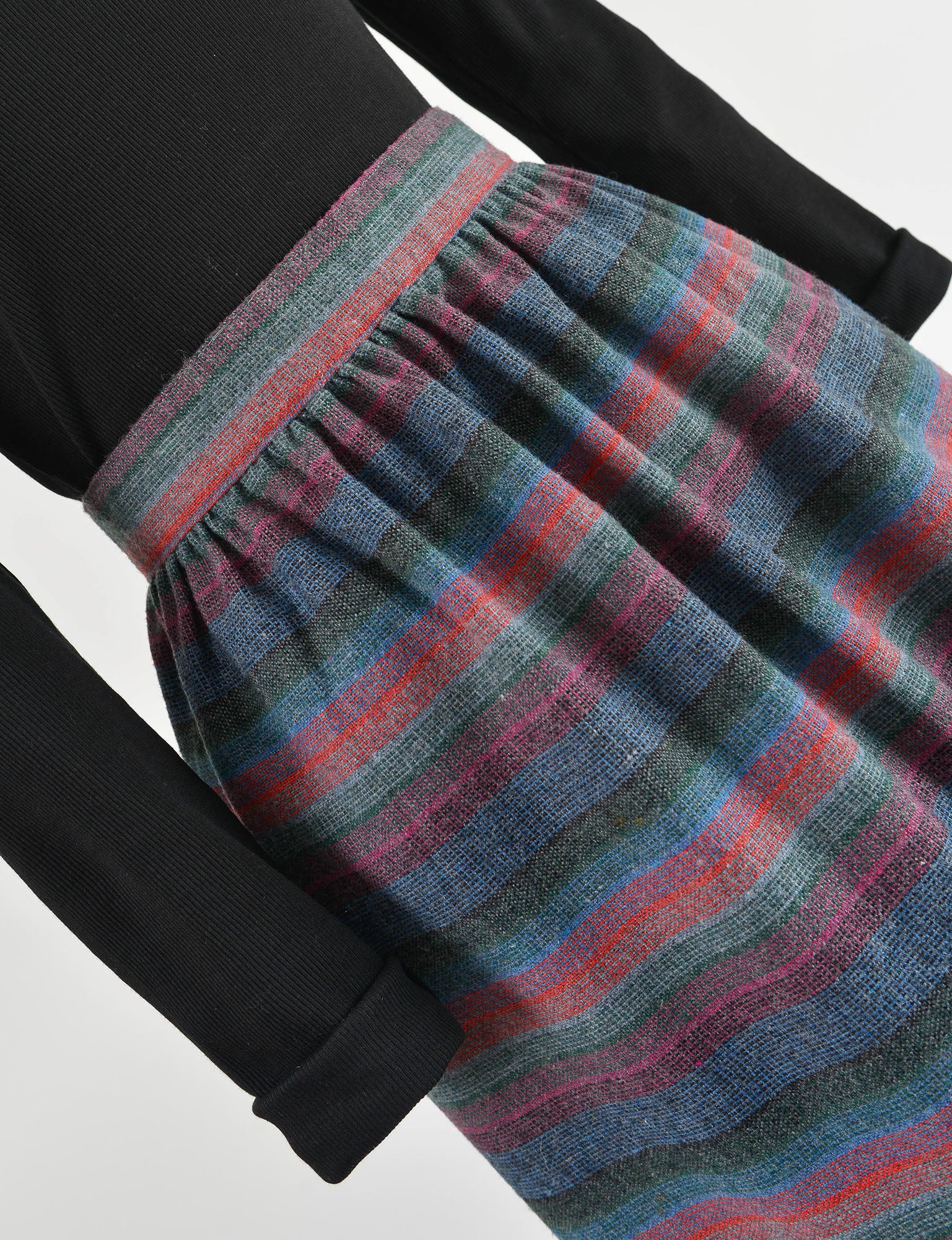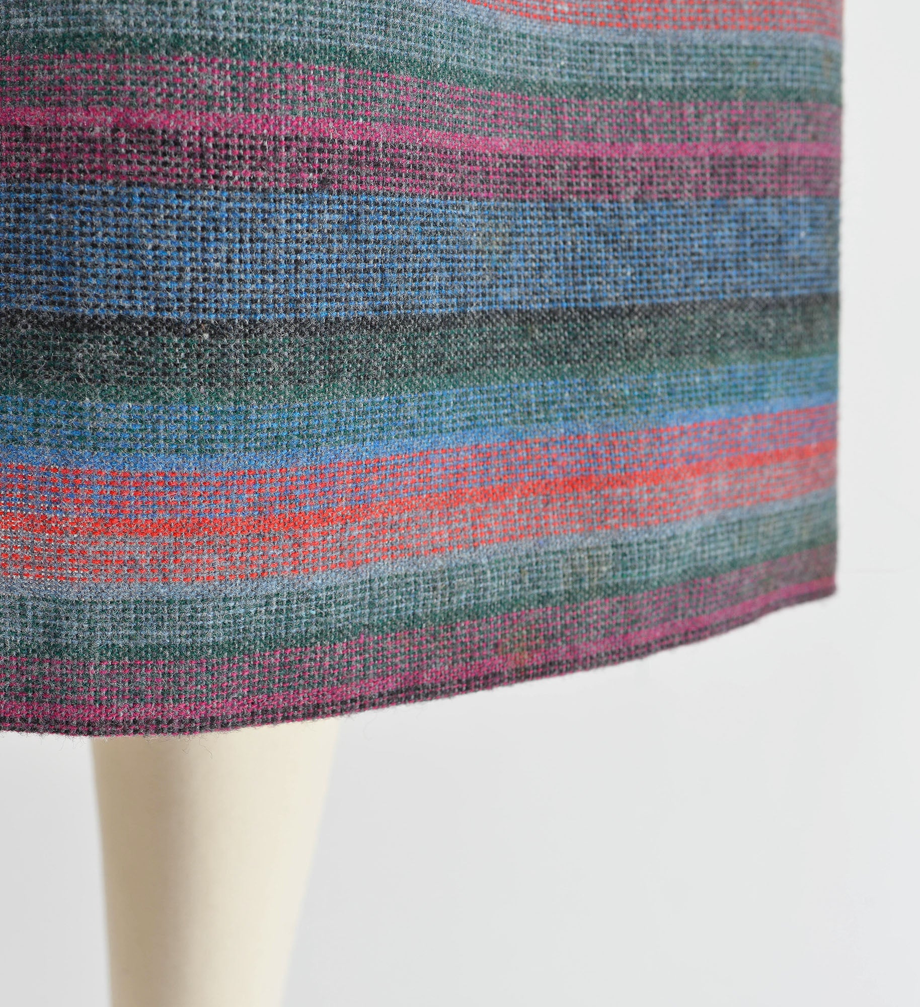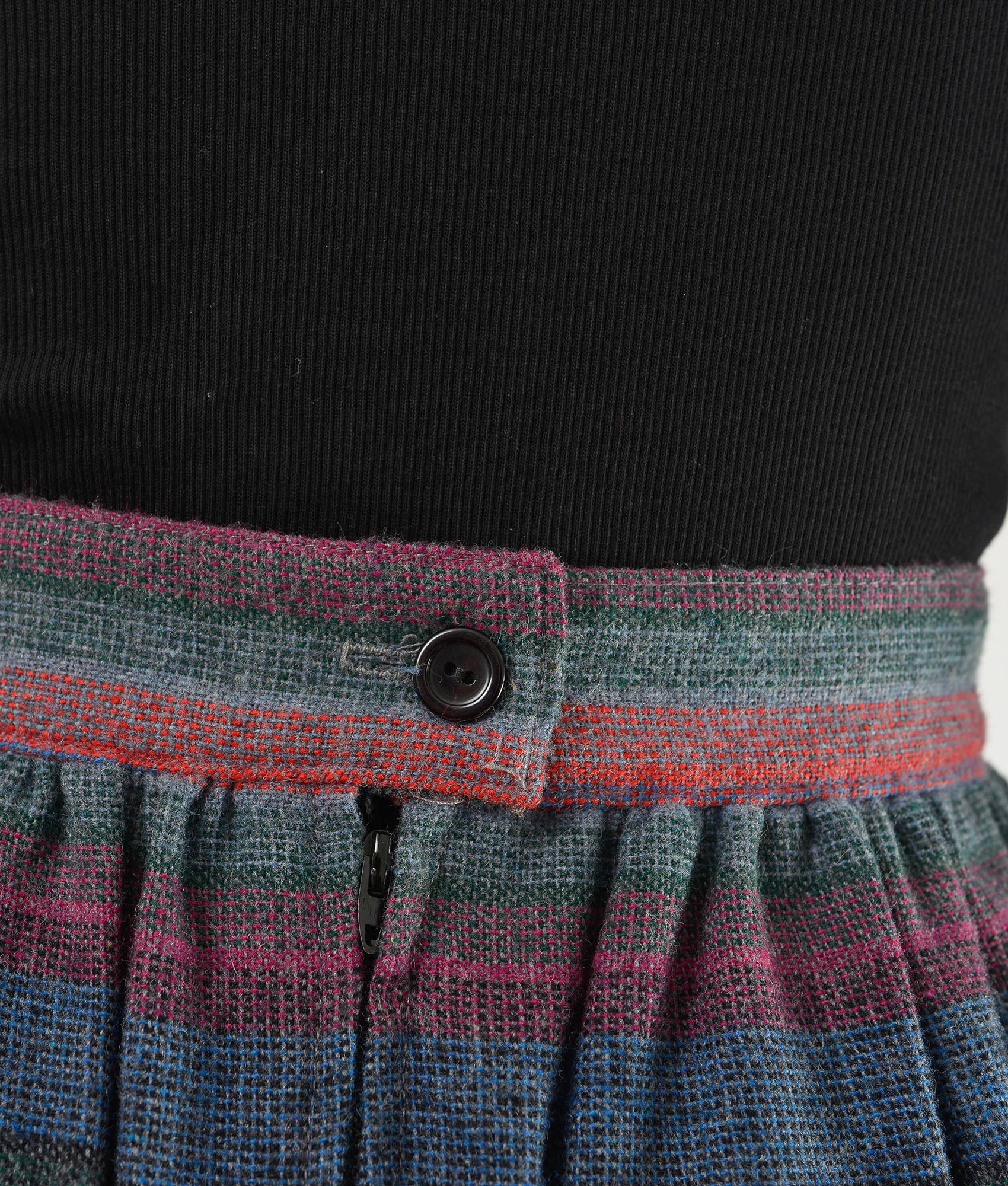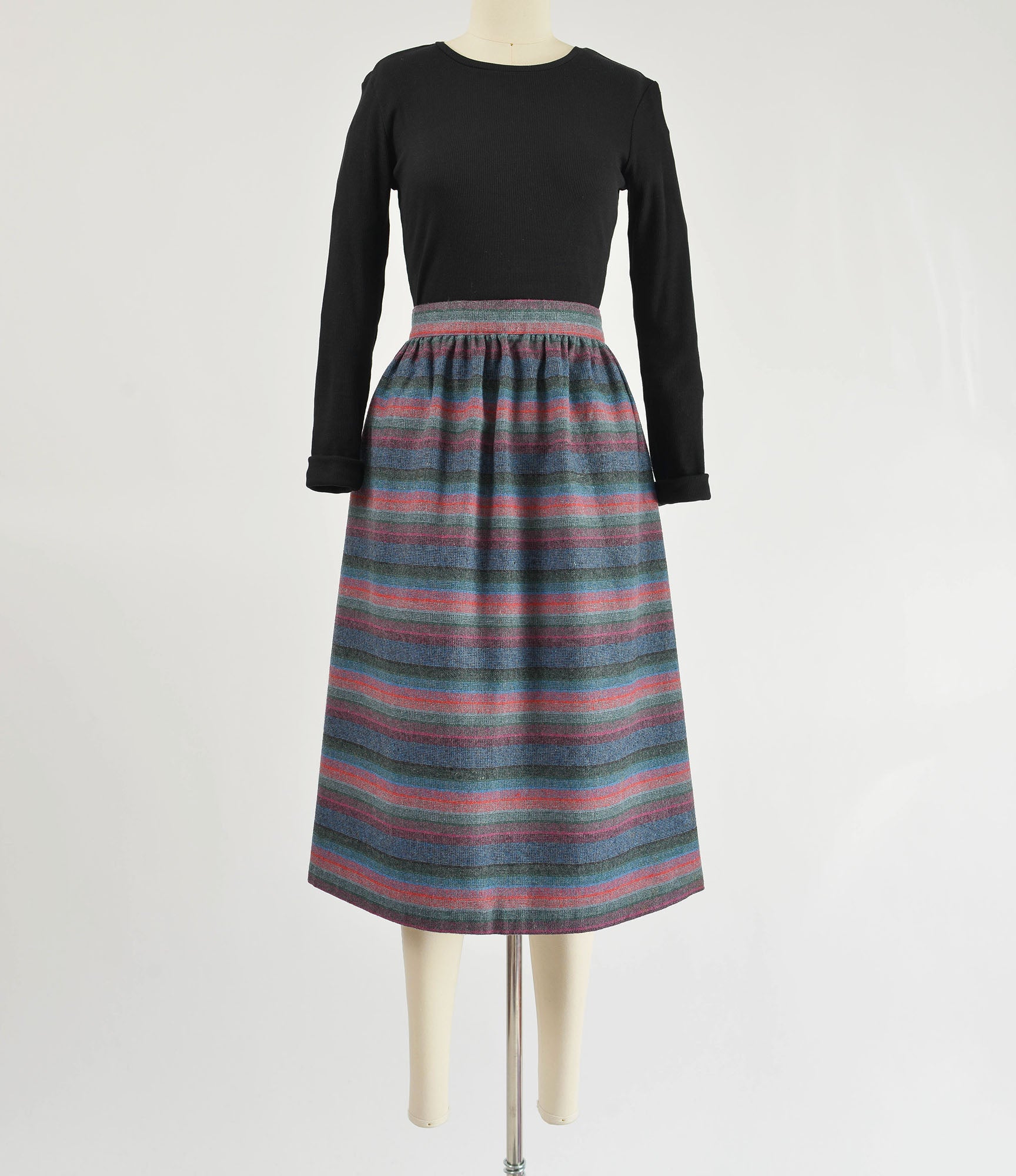 Vintage 1970's woven wool blend skirt. Multi-colored stripes. High waisted. Midi length. Zipper fly. Button waist. Unlined, but not scratchy.