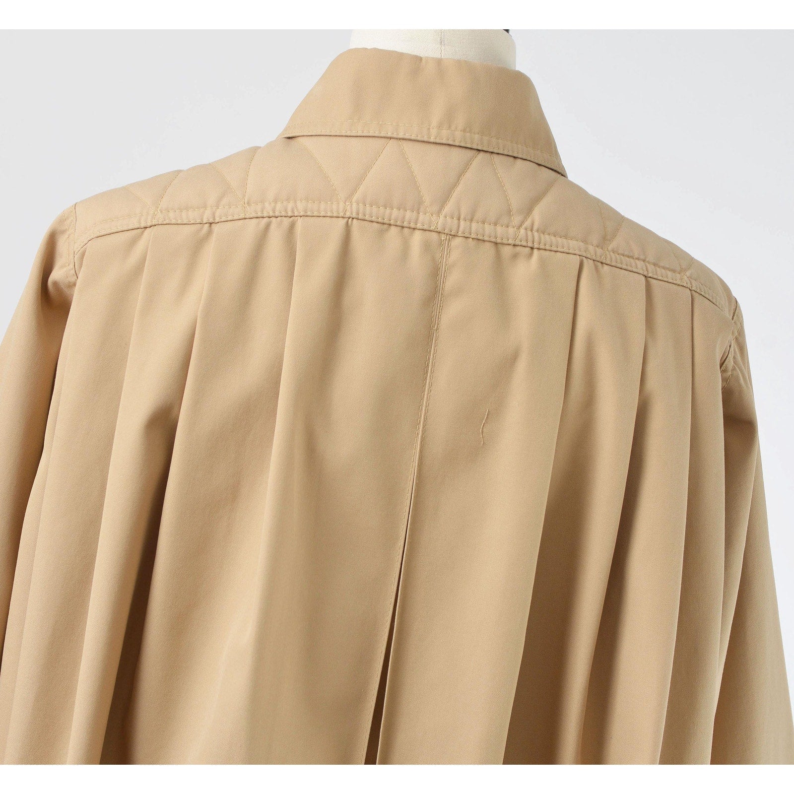 Vintage 1970's tan trench coat. Pleated full silhouette. Side pockets. Full length. Button down front. Detachable tie belt. Lined.