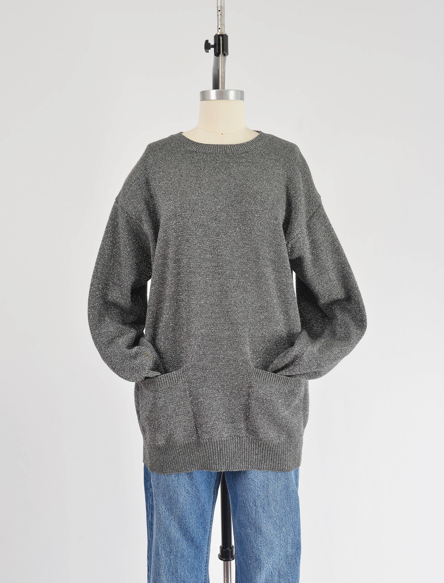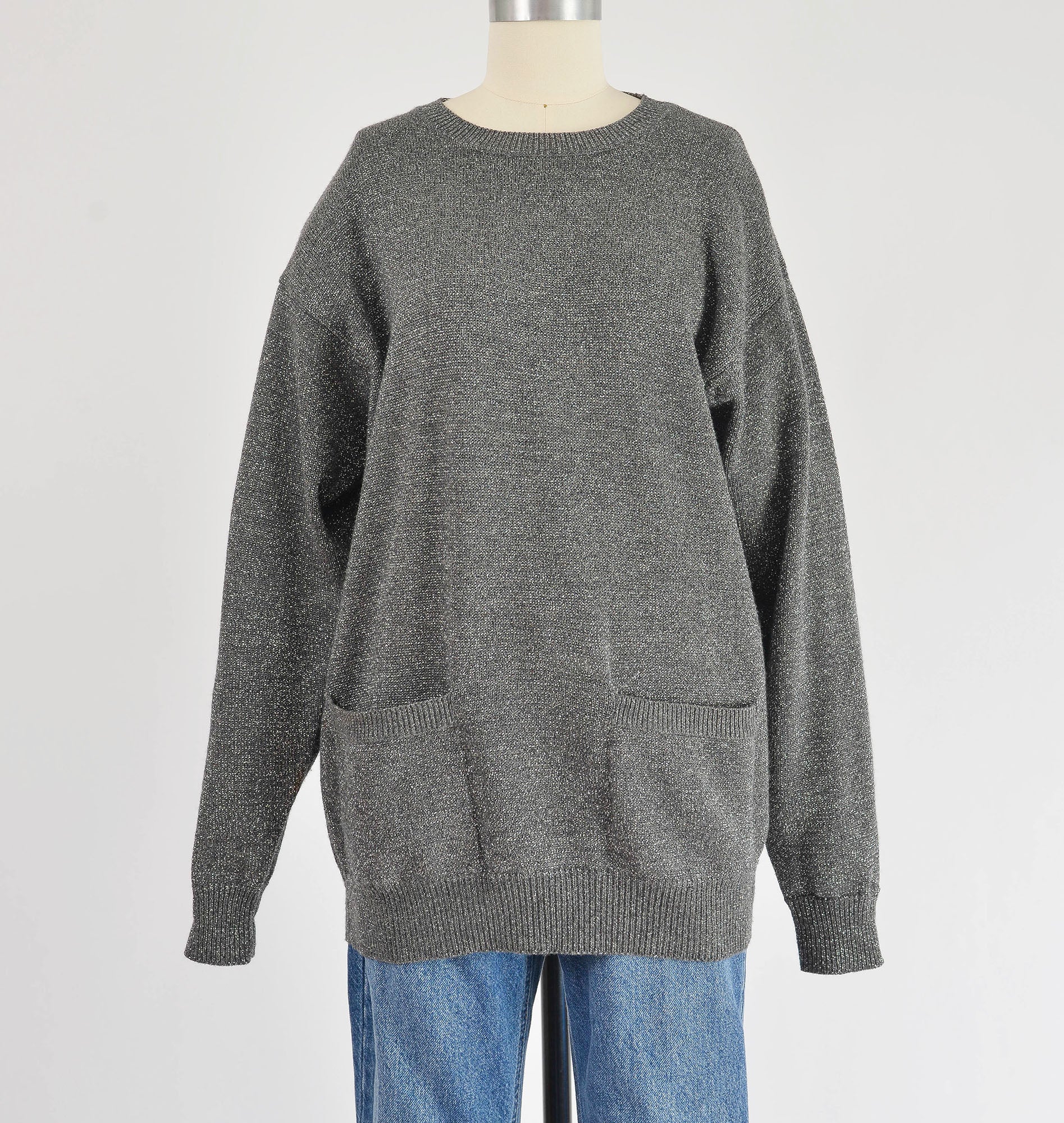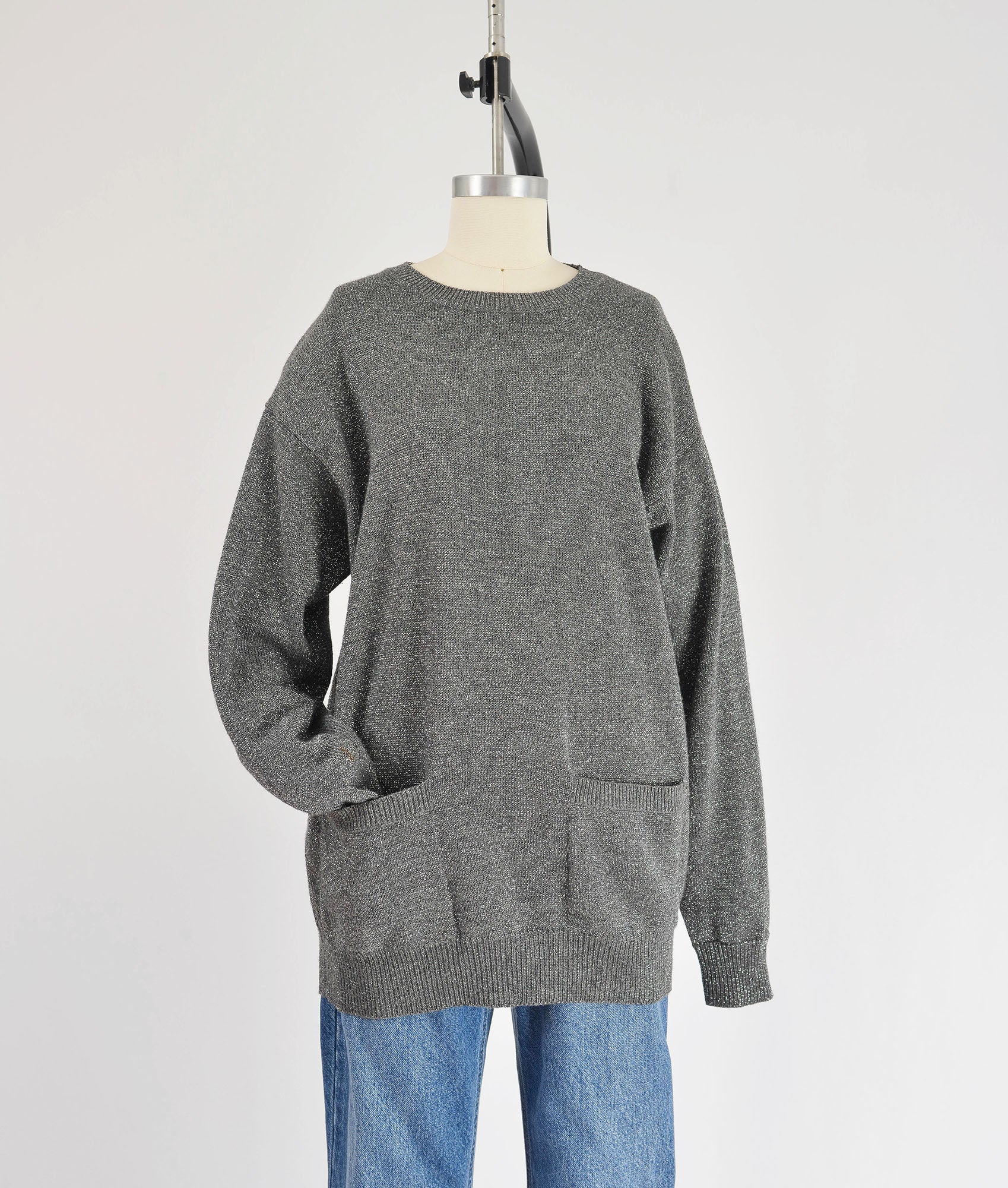 Vintage 1980's gray and metallic silver sweater. Wool blend knit. Slouchy fit. Front pockets.