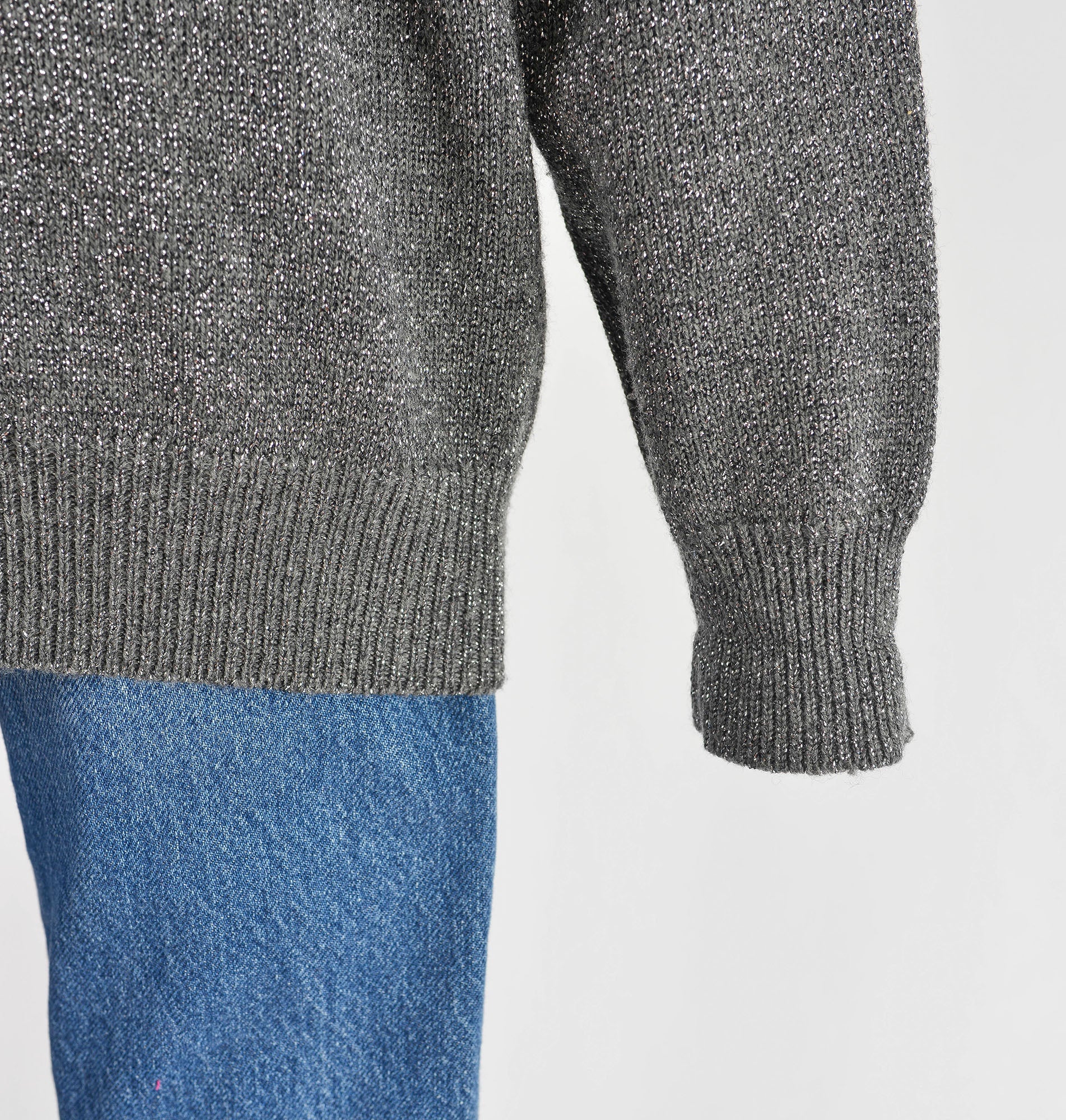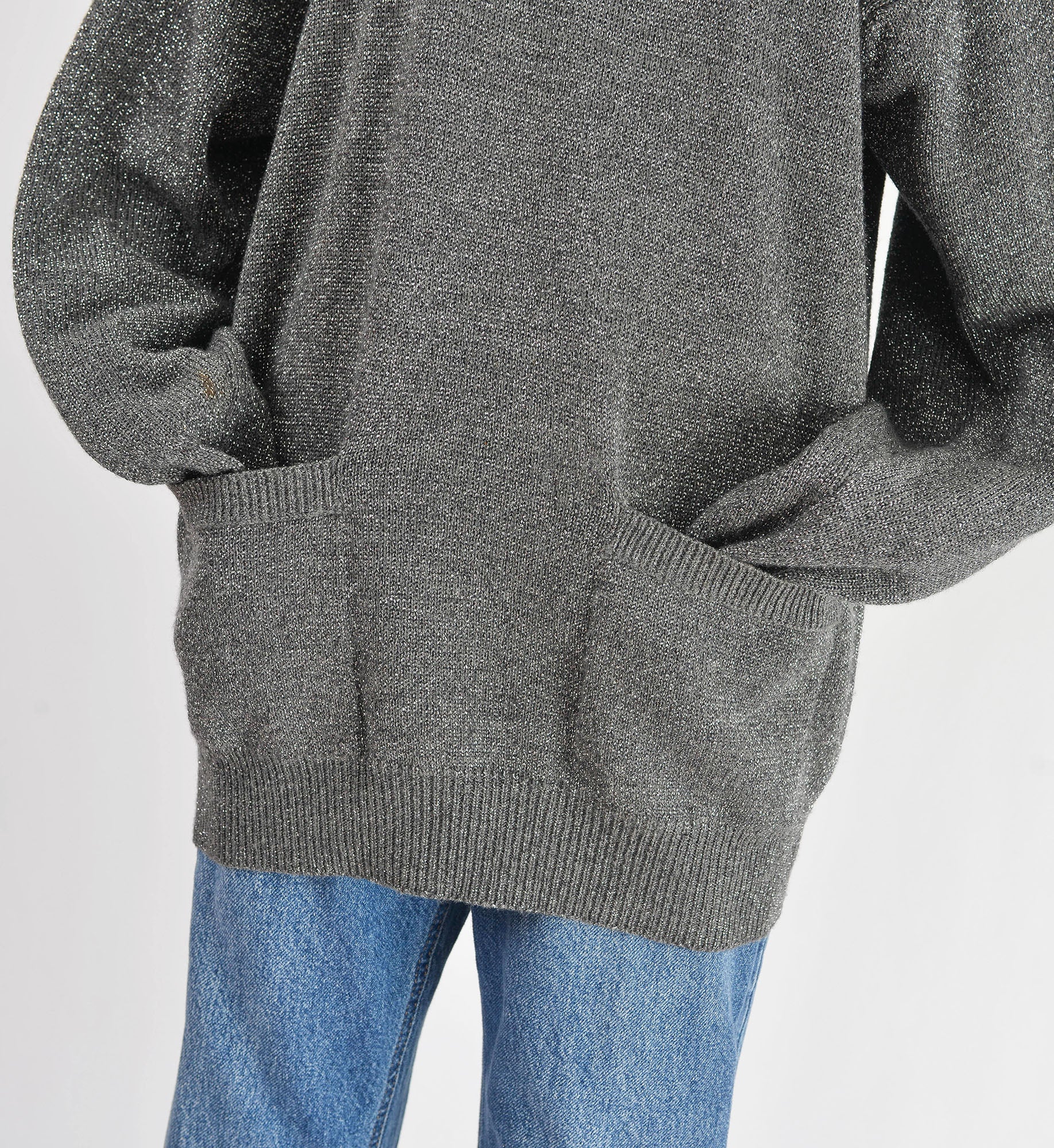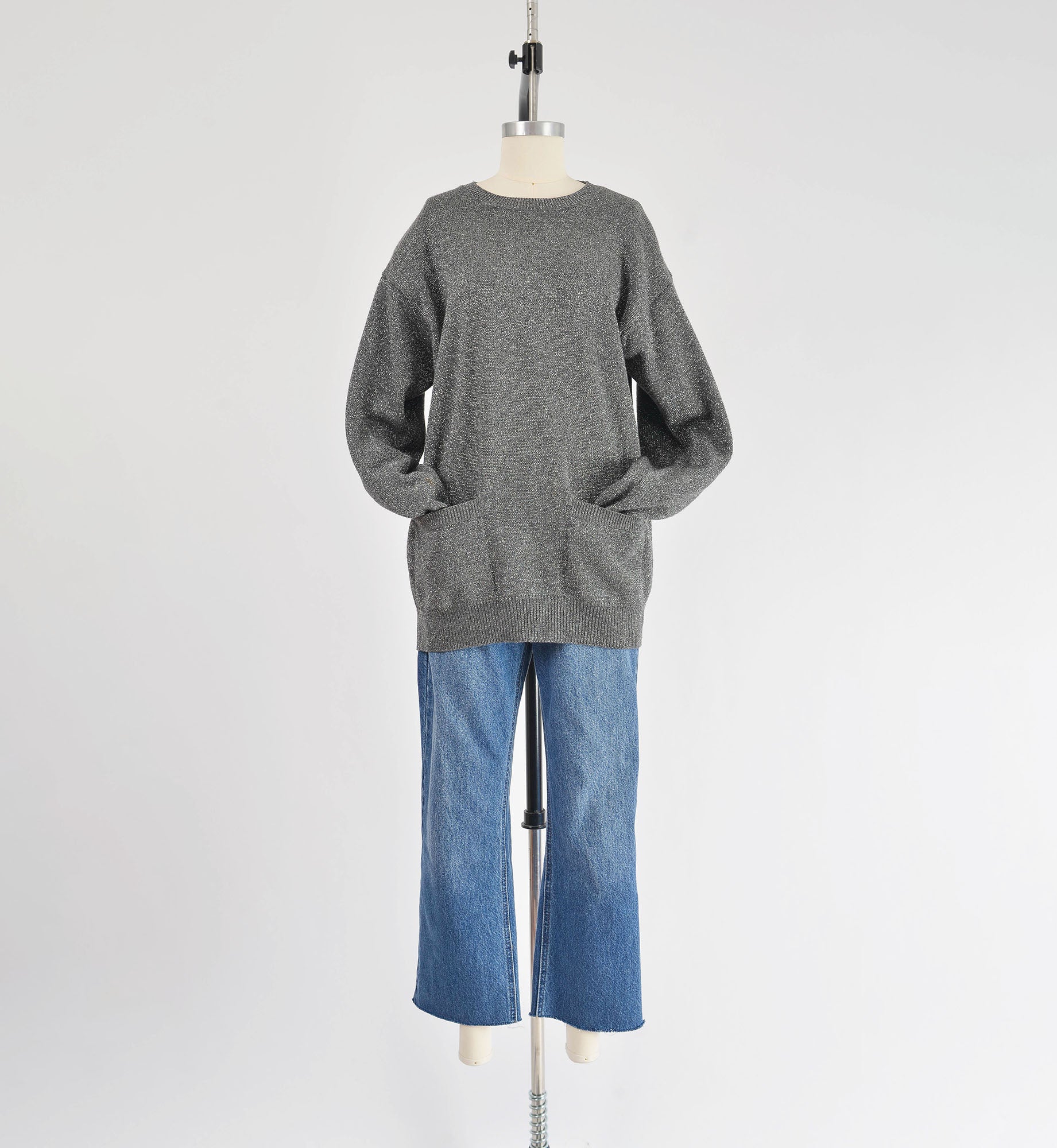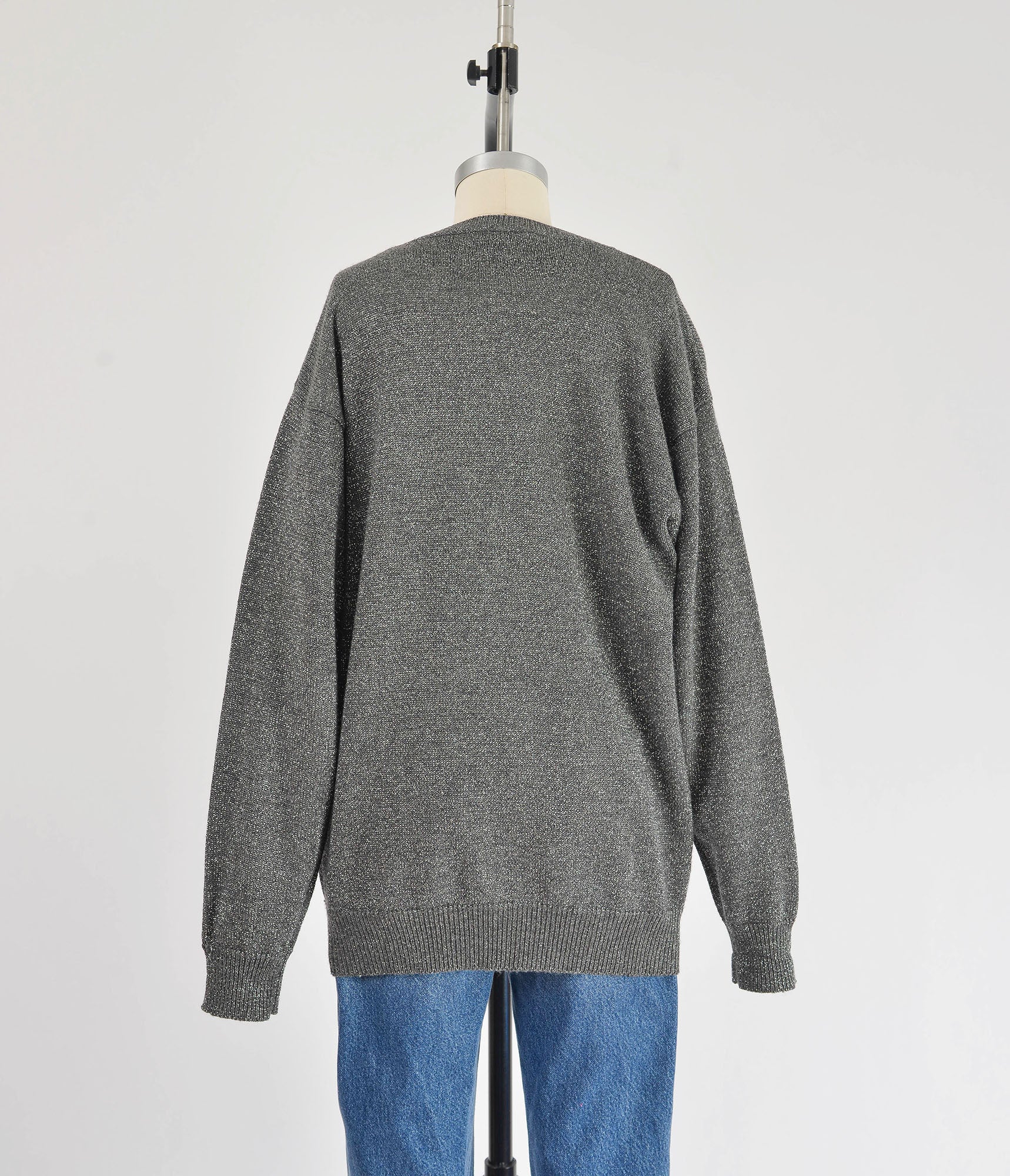 Vintage 1980's gray and metallic silver sweater. Wool blend knit. Slouchy fit. Front pockets.
