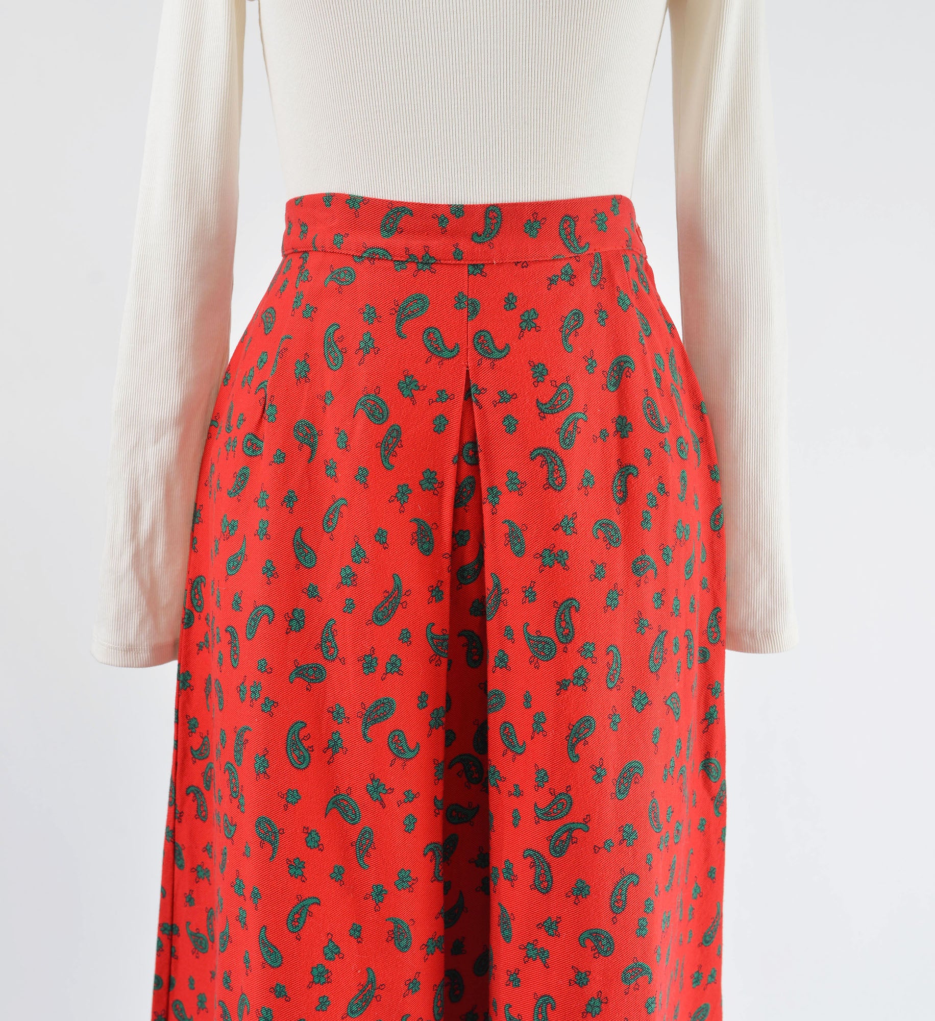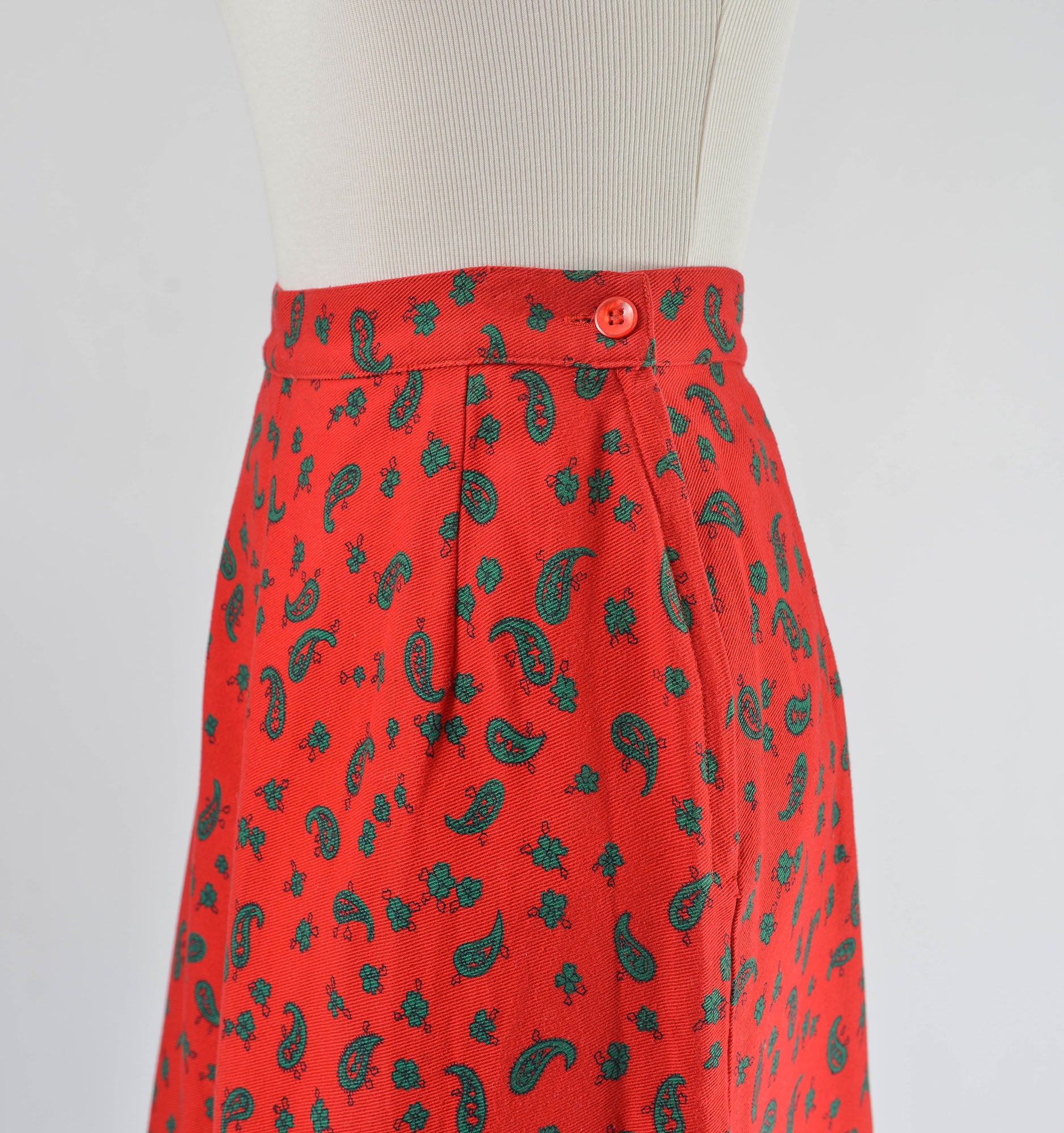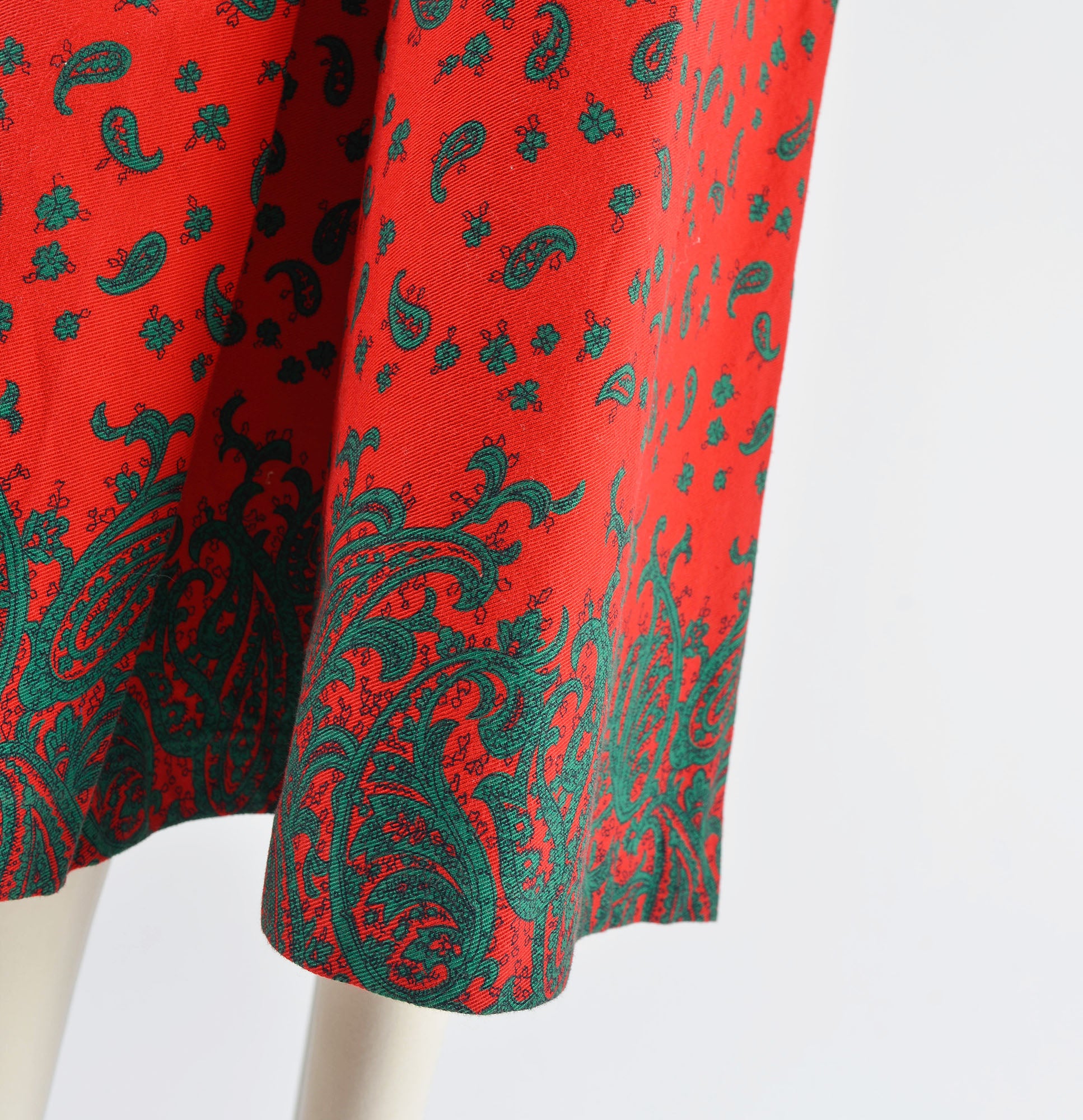Vintage 1980's red and green skirt. Paisley print. Cotton twill. Pleat front and back. Midi length. A-line silhouette. Zipper closure. Button waist.
