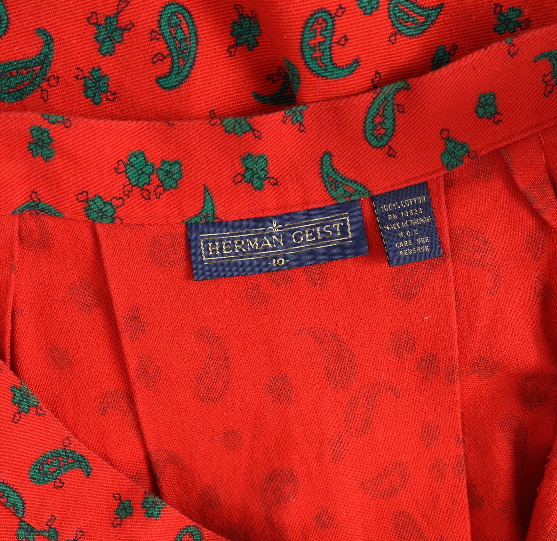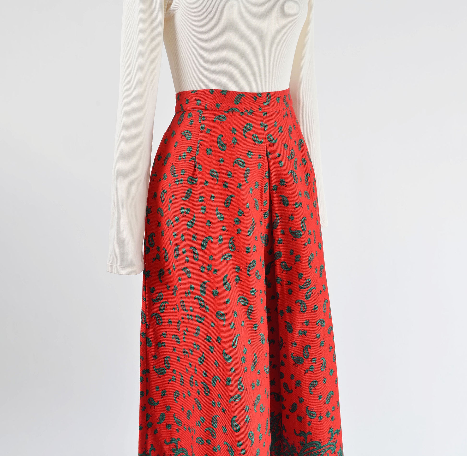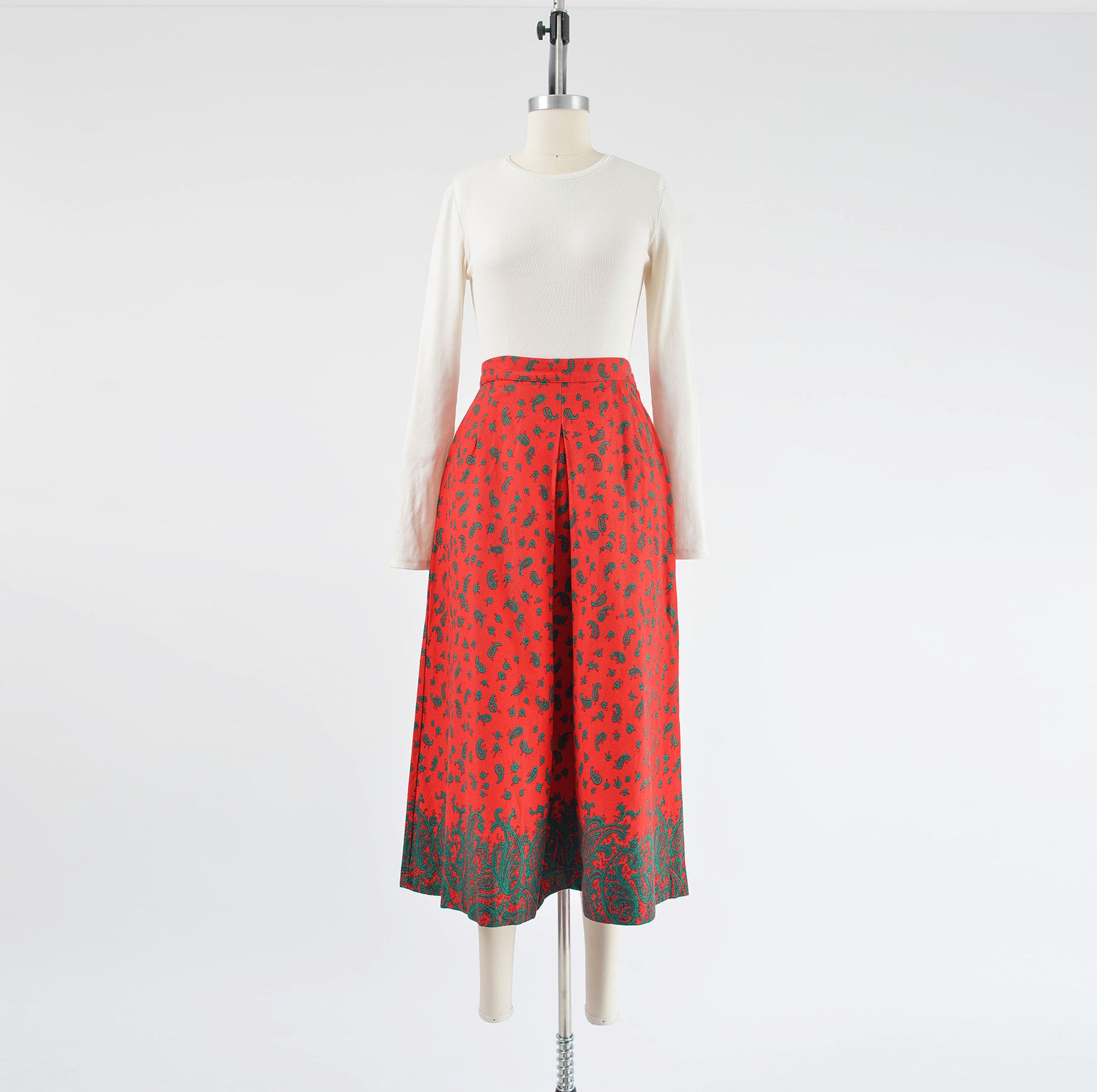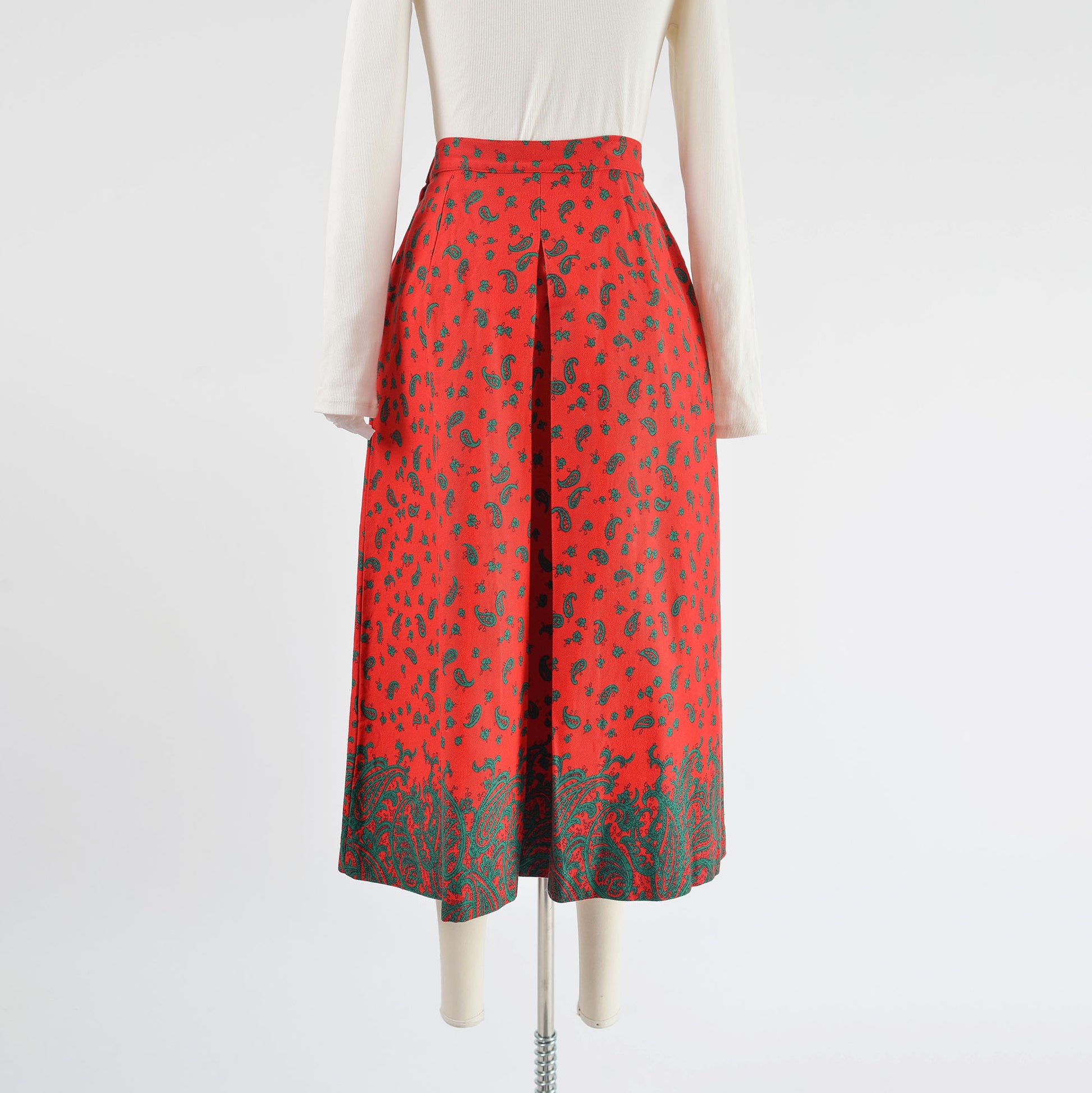 Vintage 1980's red and green skirt. Paisley print. Cotton twill. Pleat front and back. Midi length. A-line silhouette. Zipper closure. Button waist.