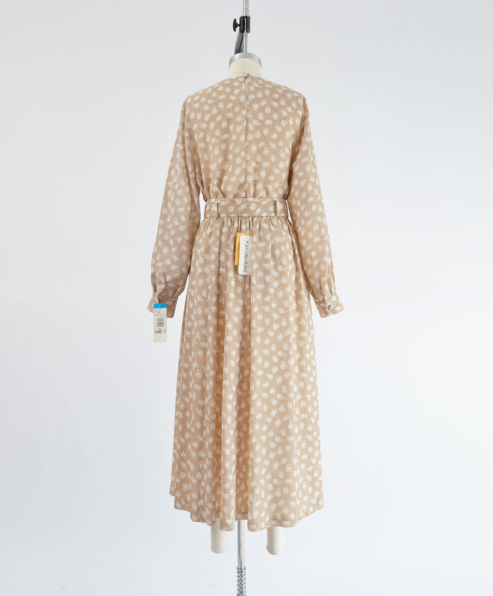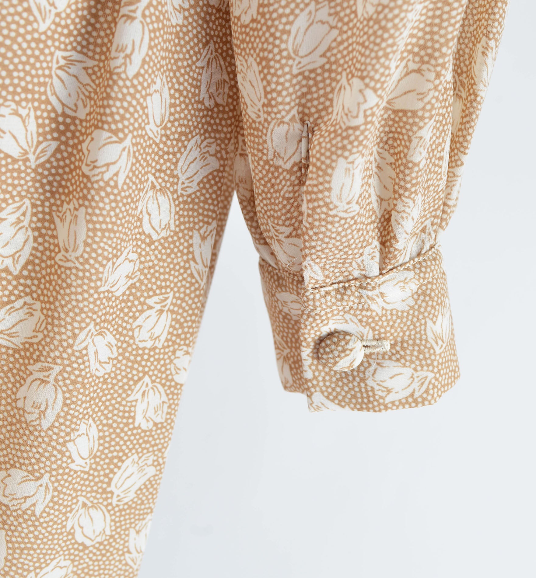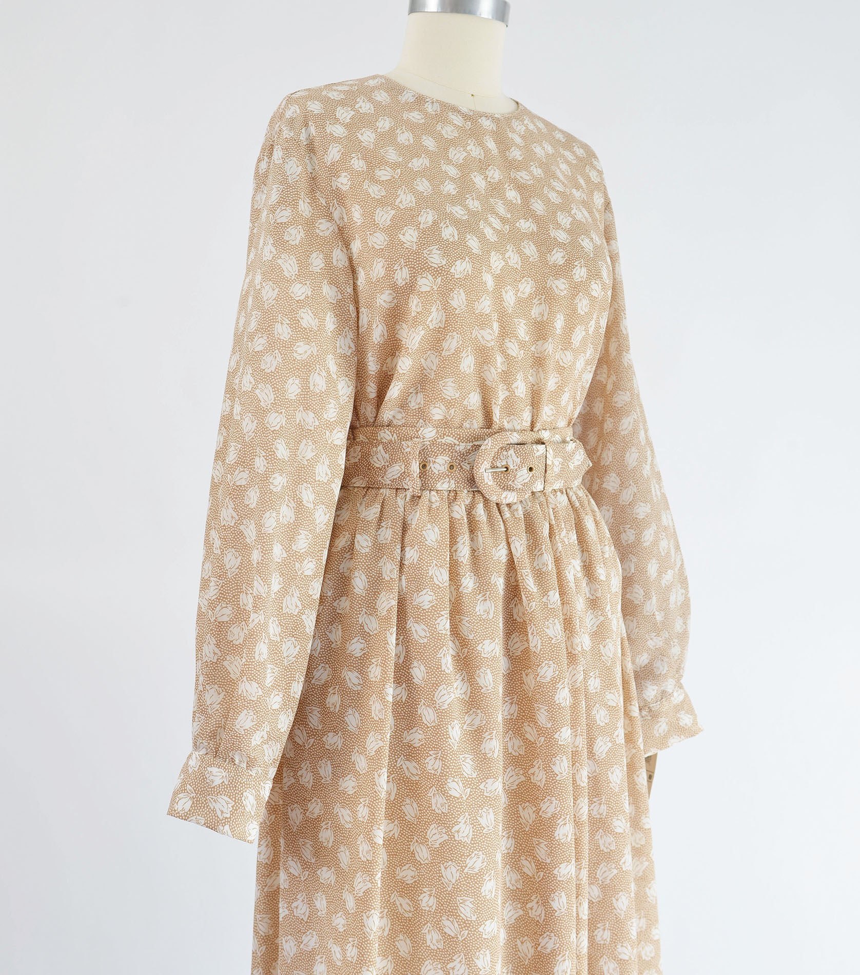 Vintage 1980's tan and white floral set. Semi sheer blouse. Button down cuffs. Full high waisted skirt. Midi or ankle length, depending on your height. Matching belt. Zipper closure. The skirt is lined.