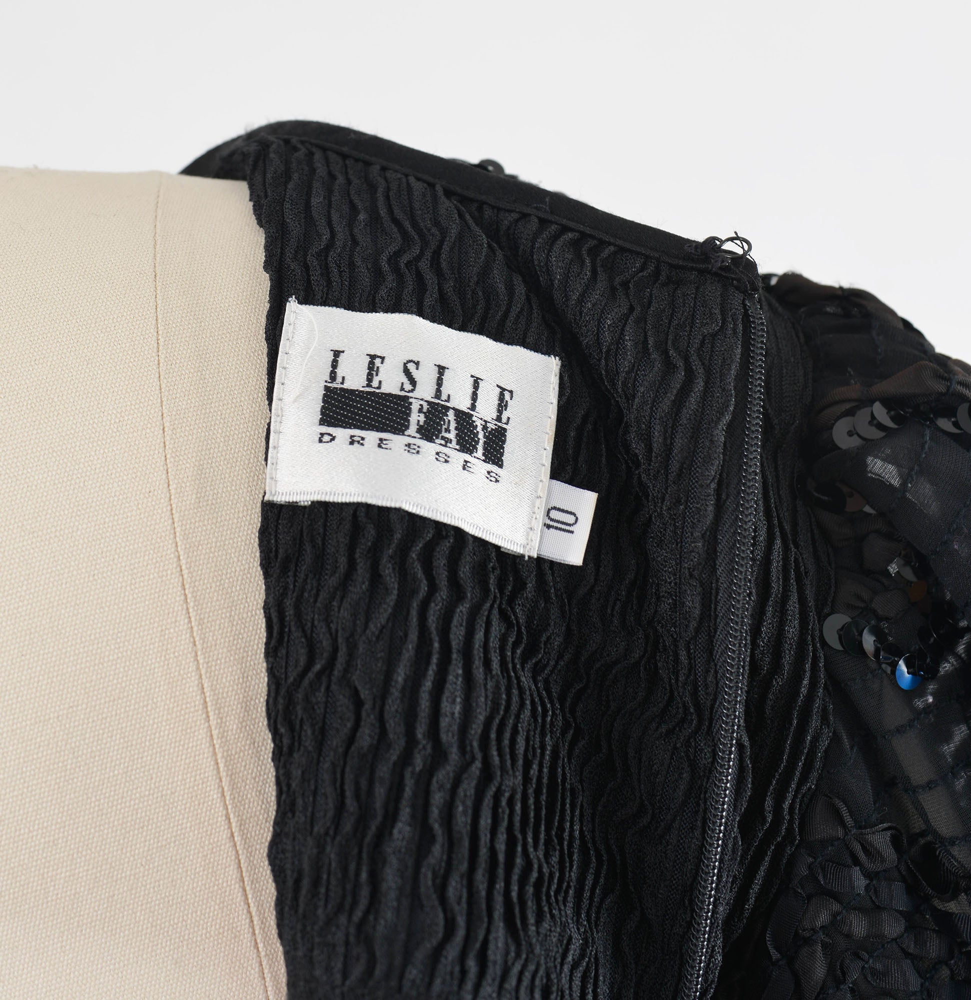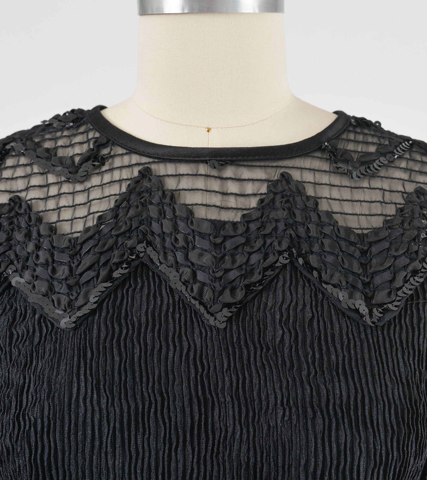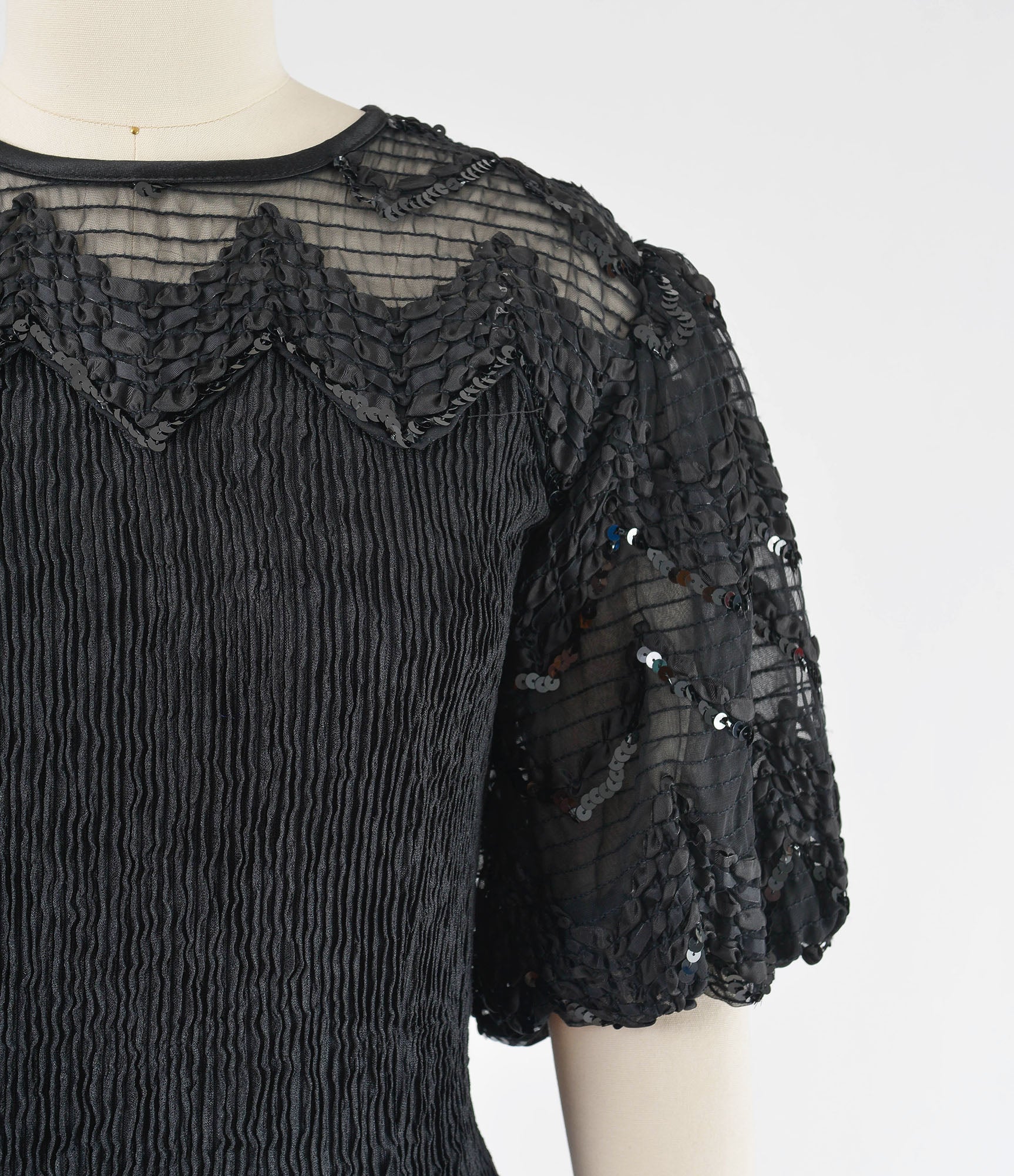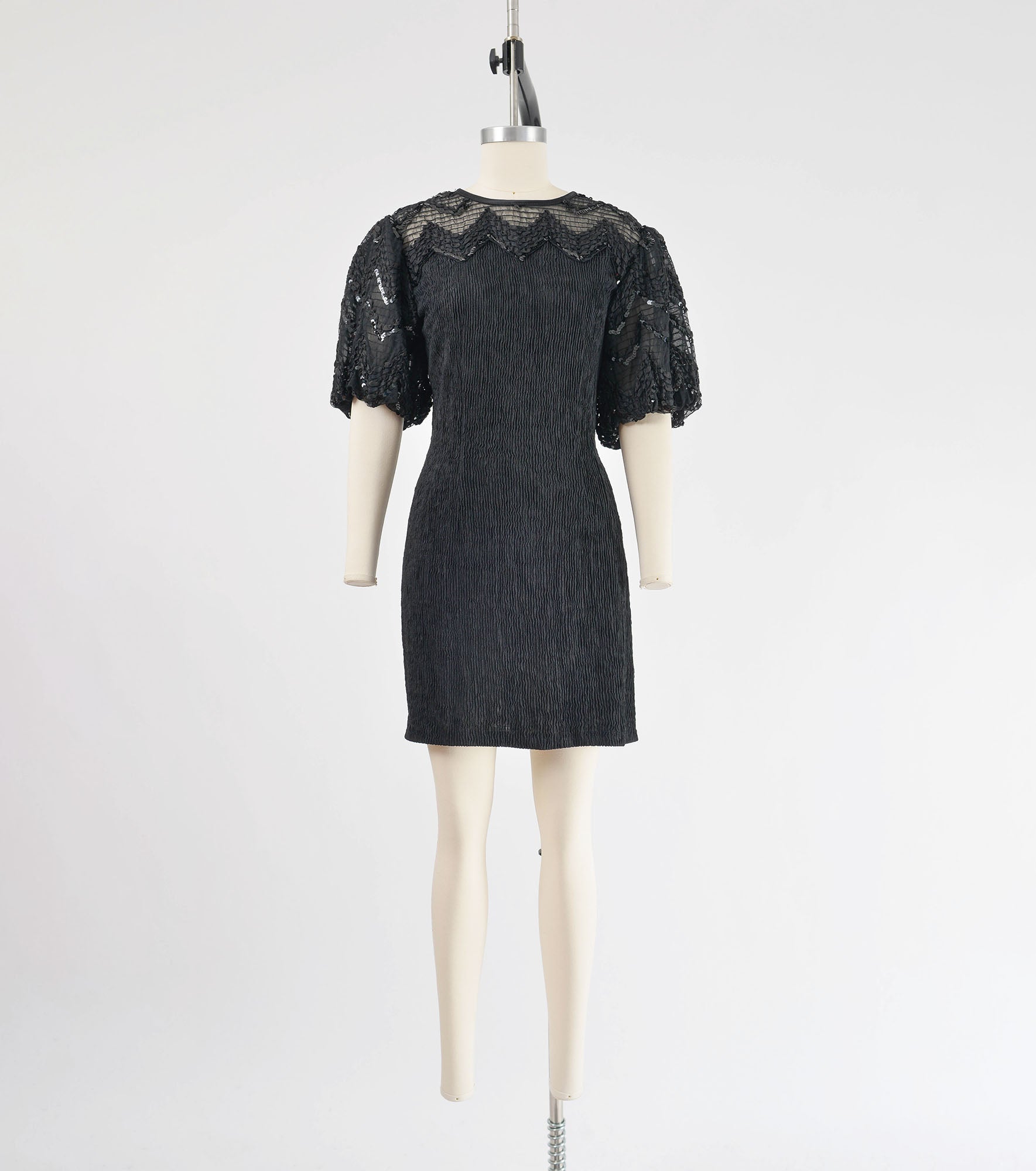 Vintage 1990's black mini dress. Textured stretchy knit fabric. Sheer organza neckline. Zig zag sequined design. Puff sleeves. Zipper closure.