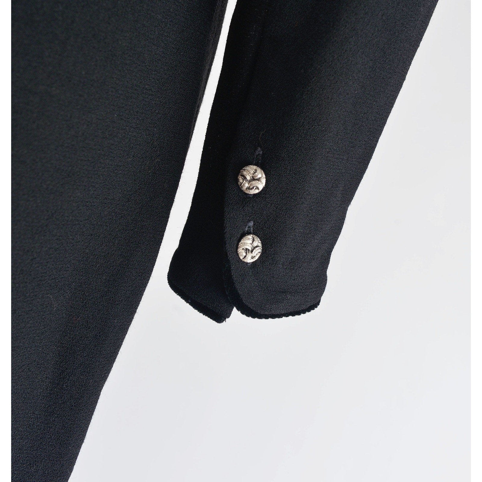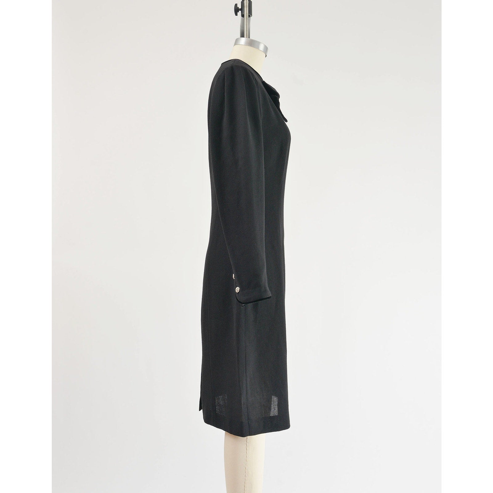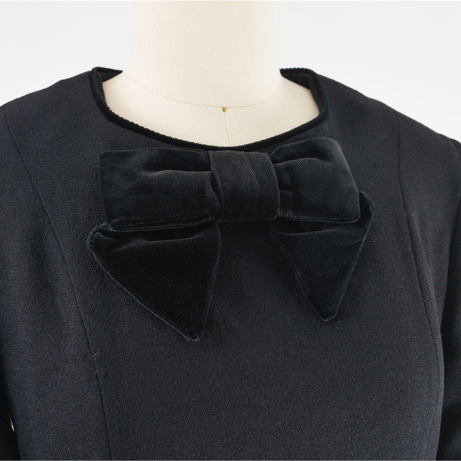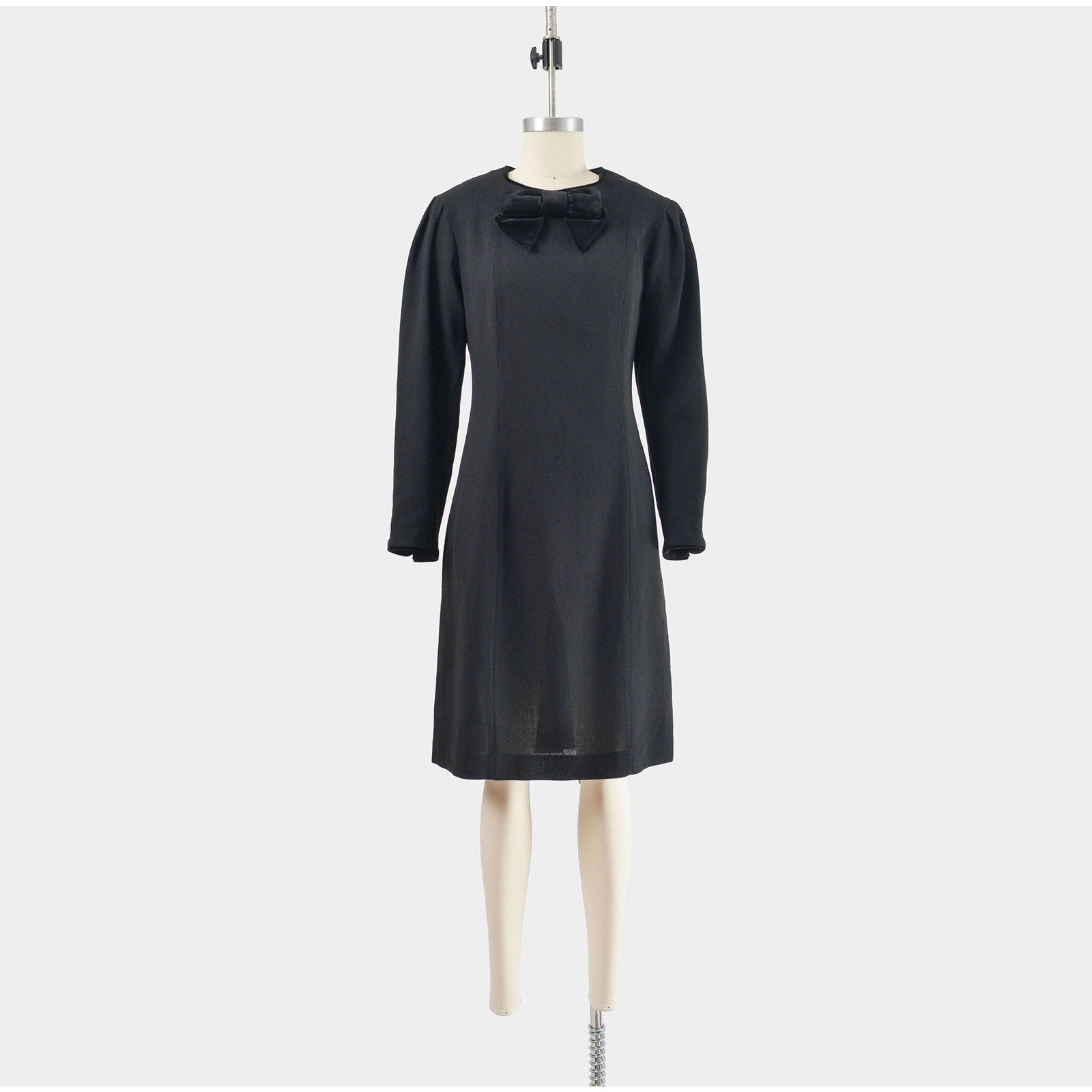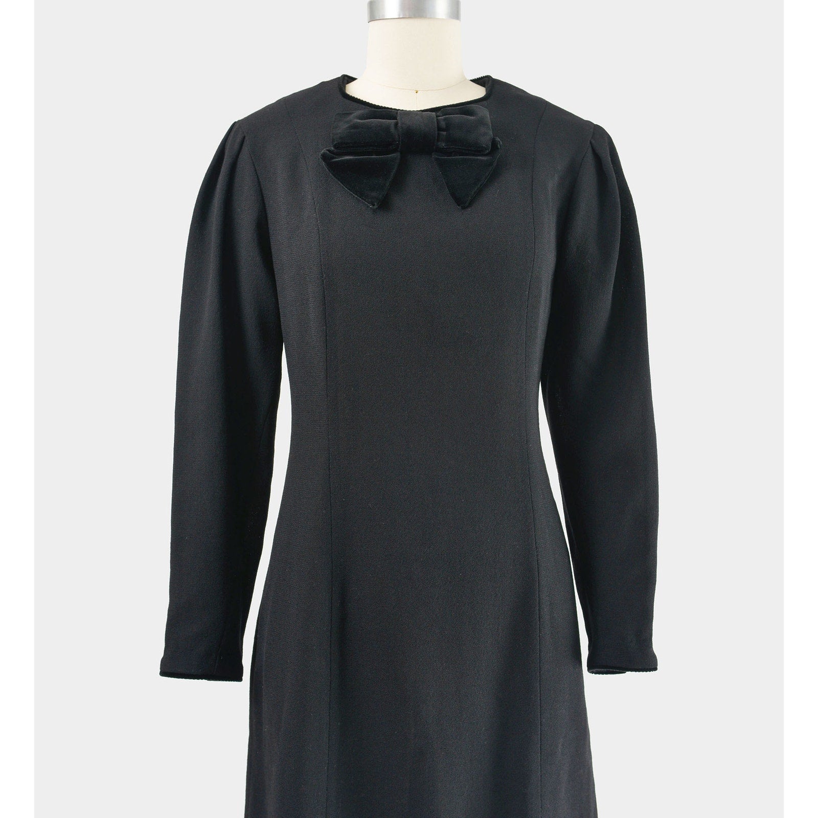 Vintage 1990's black wool dress. Lightweight wool crepe. Sheath silhouette. Puff sleeves. Button down wrists. Velvet bow at center neck. Rear zipper. Unlined, but not a scratchy wool. Light shoulder padding.