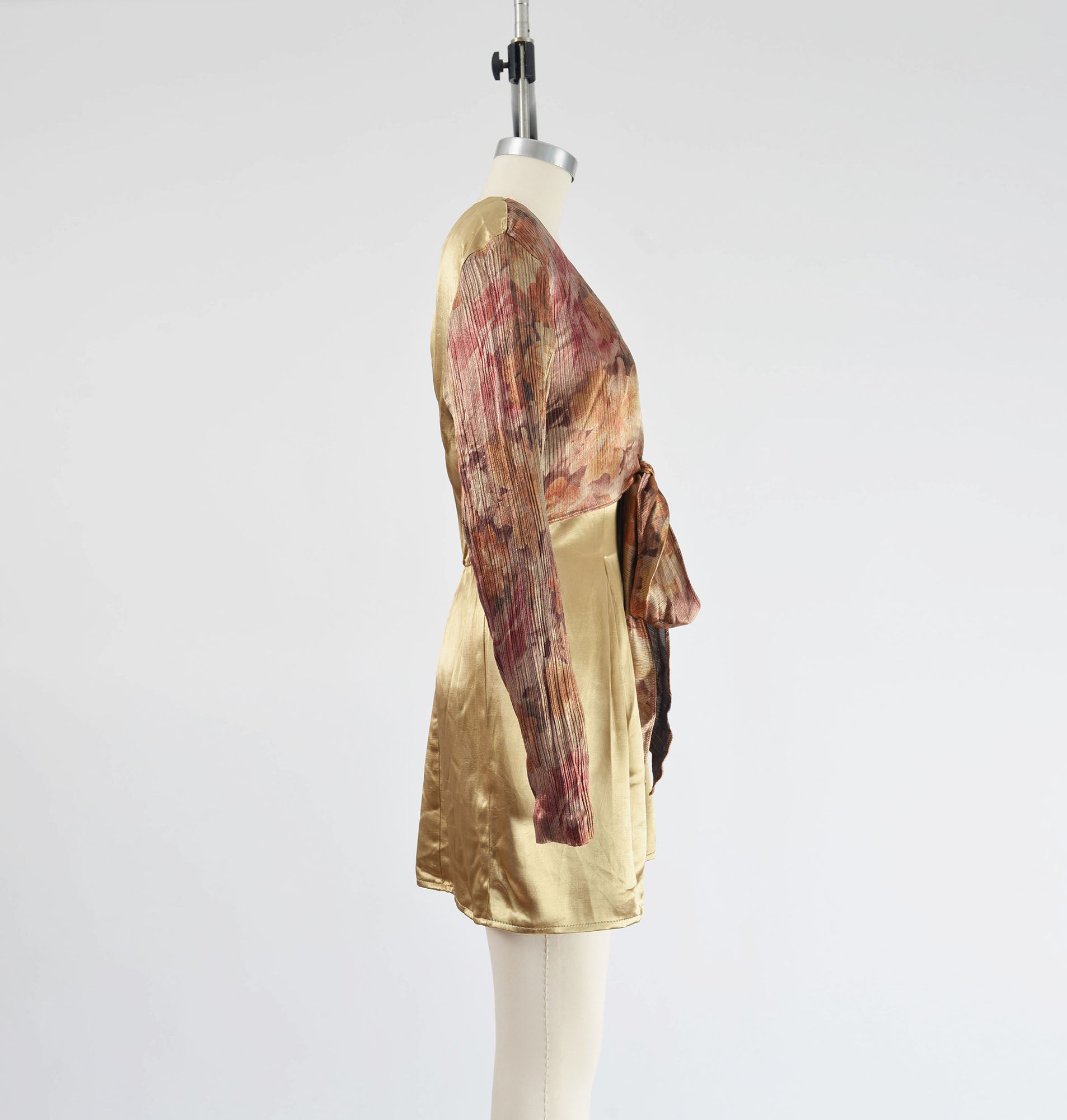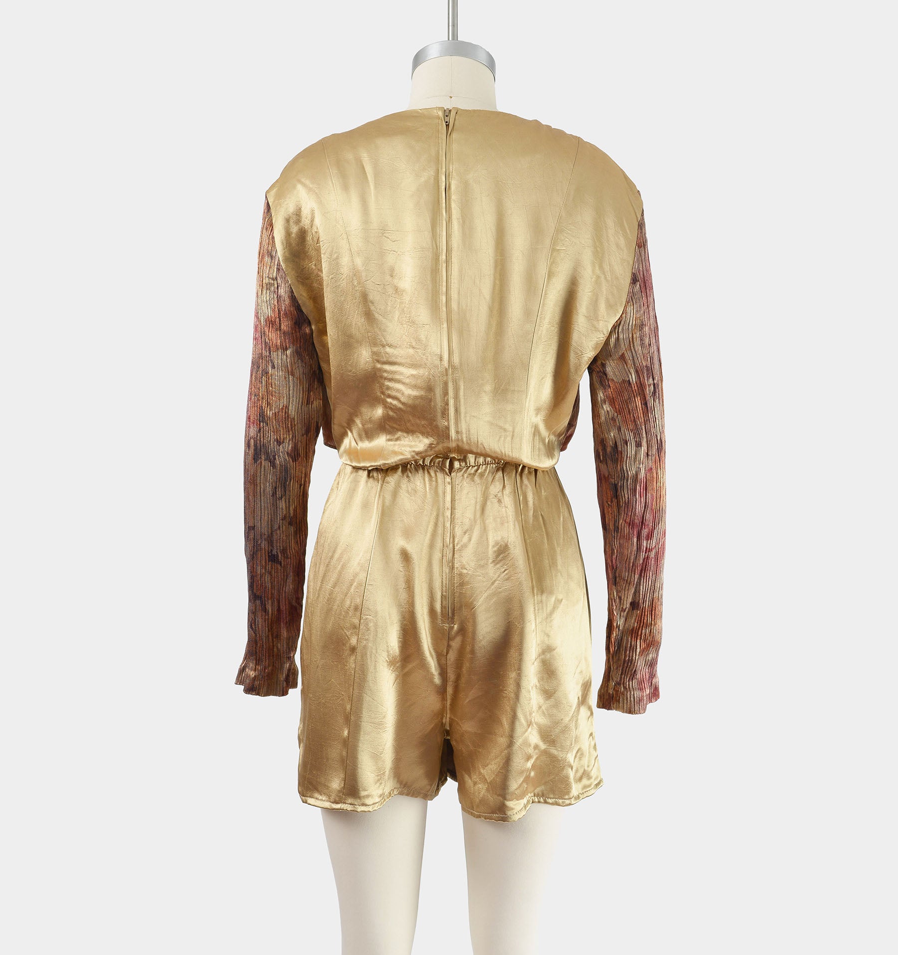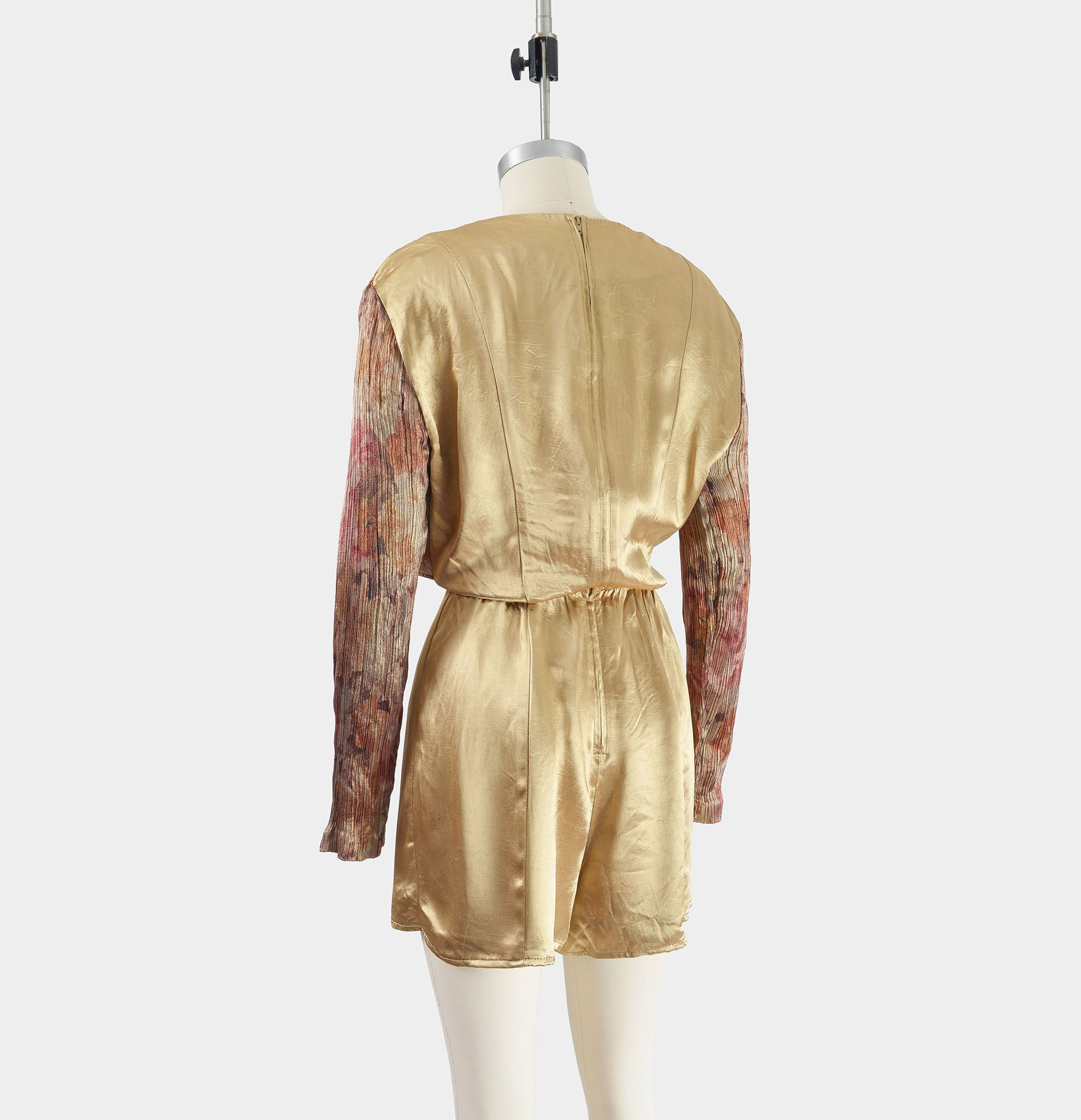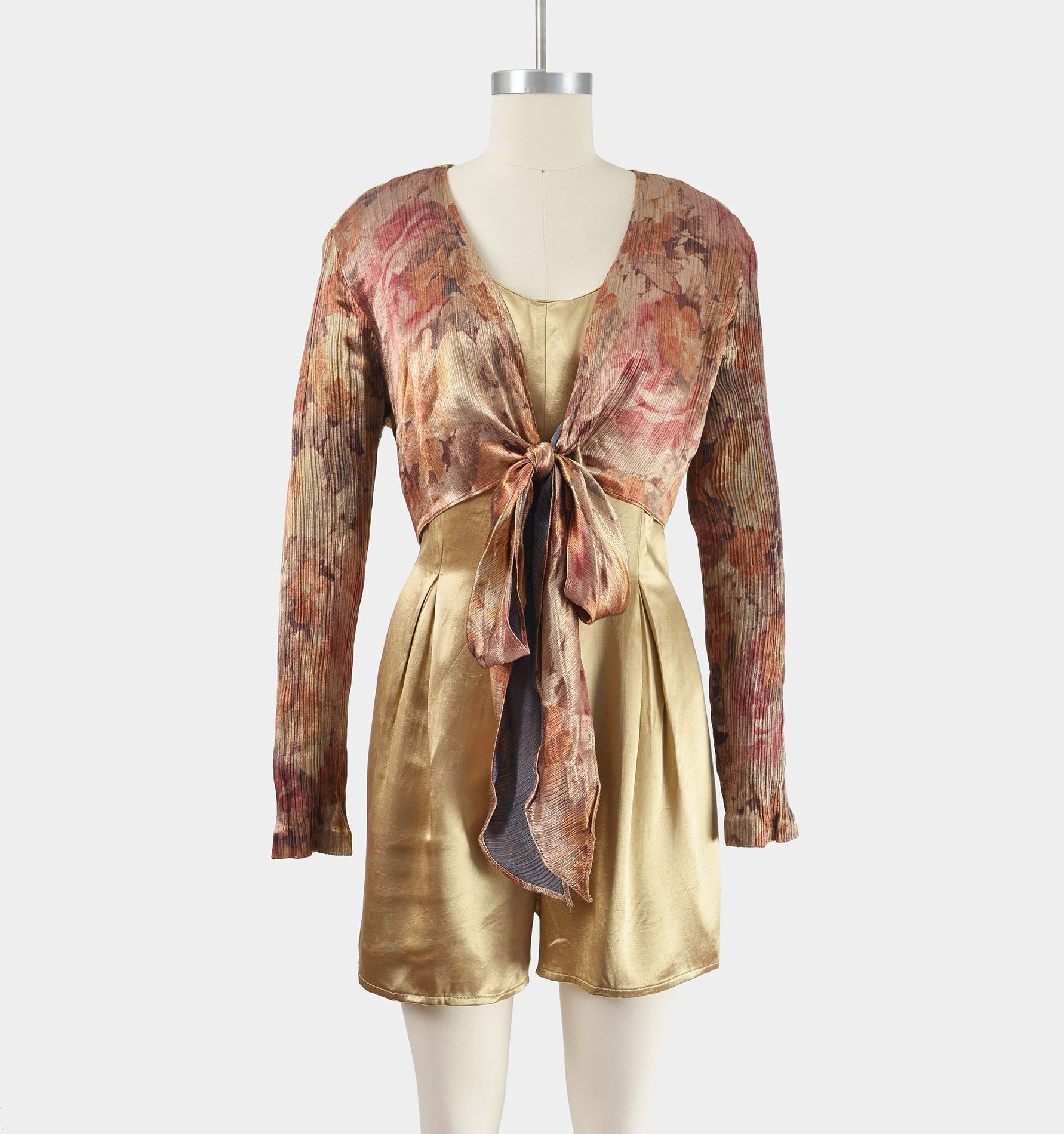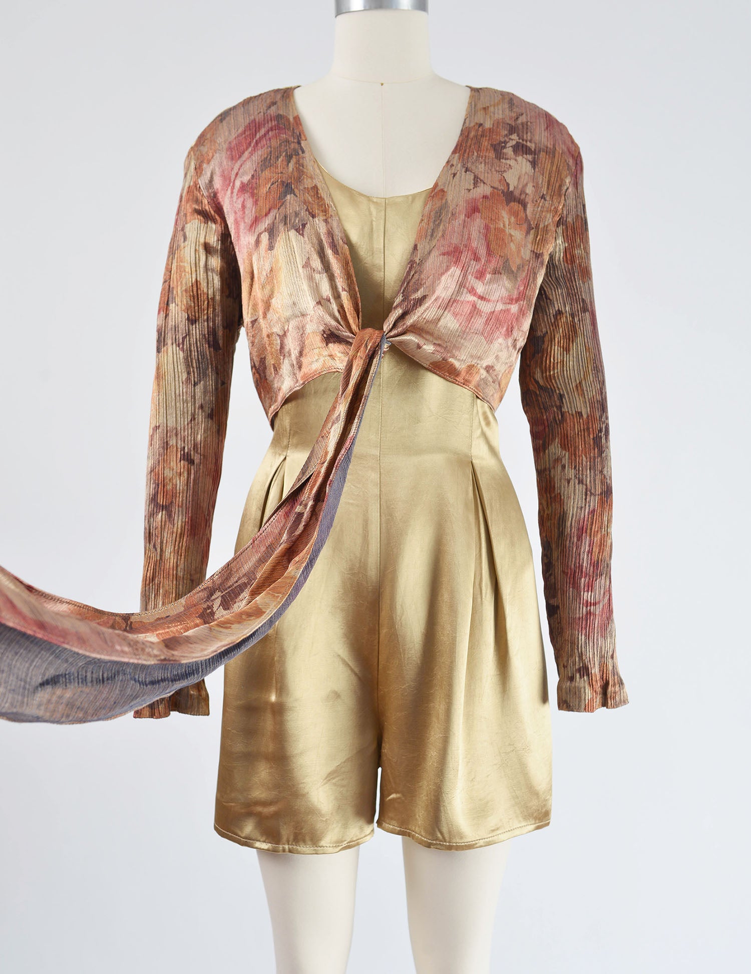 Vintage 1990's tan satin romper. One piece with a layered look. Floral crop top overlay that ties at front. Pleated at front waist. Relaxed fit. Rear zipper. Unlined.