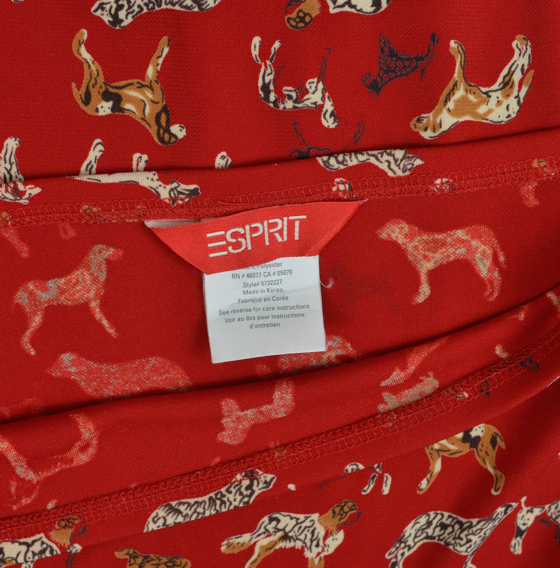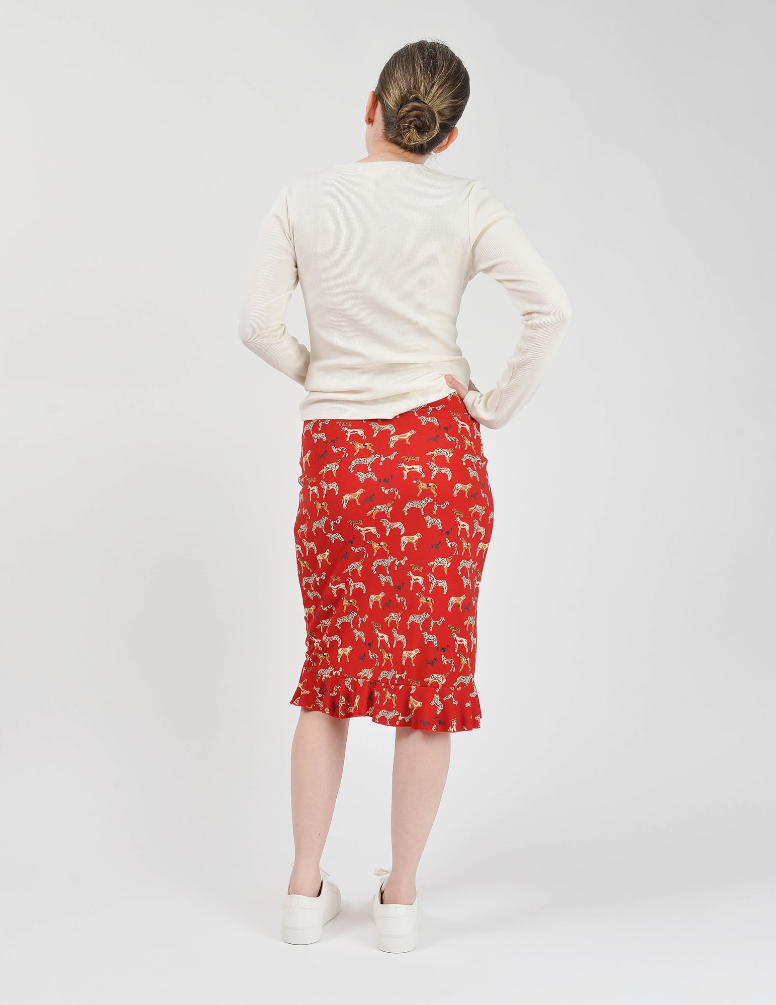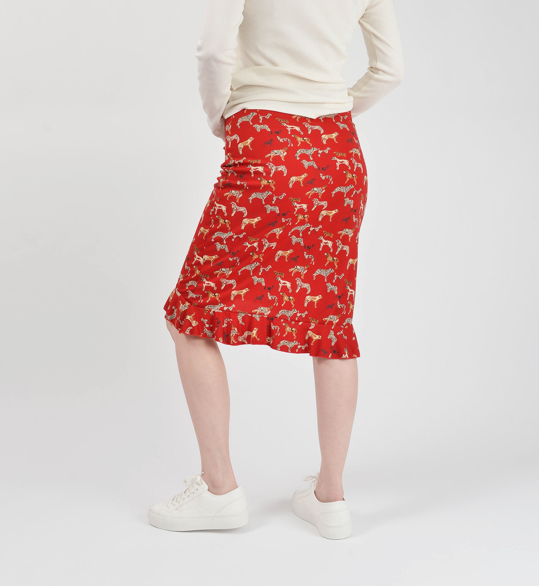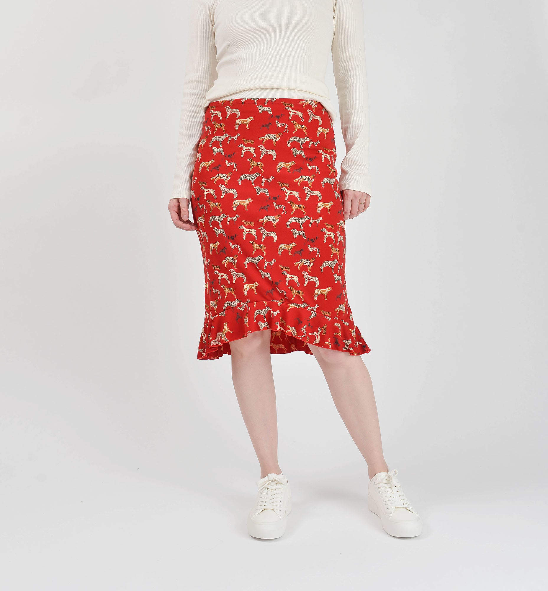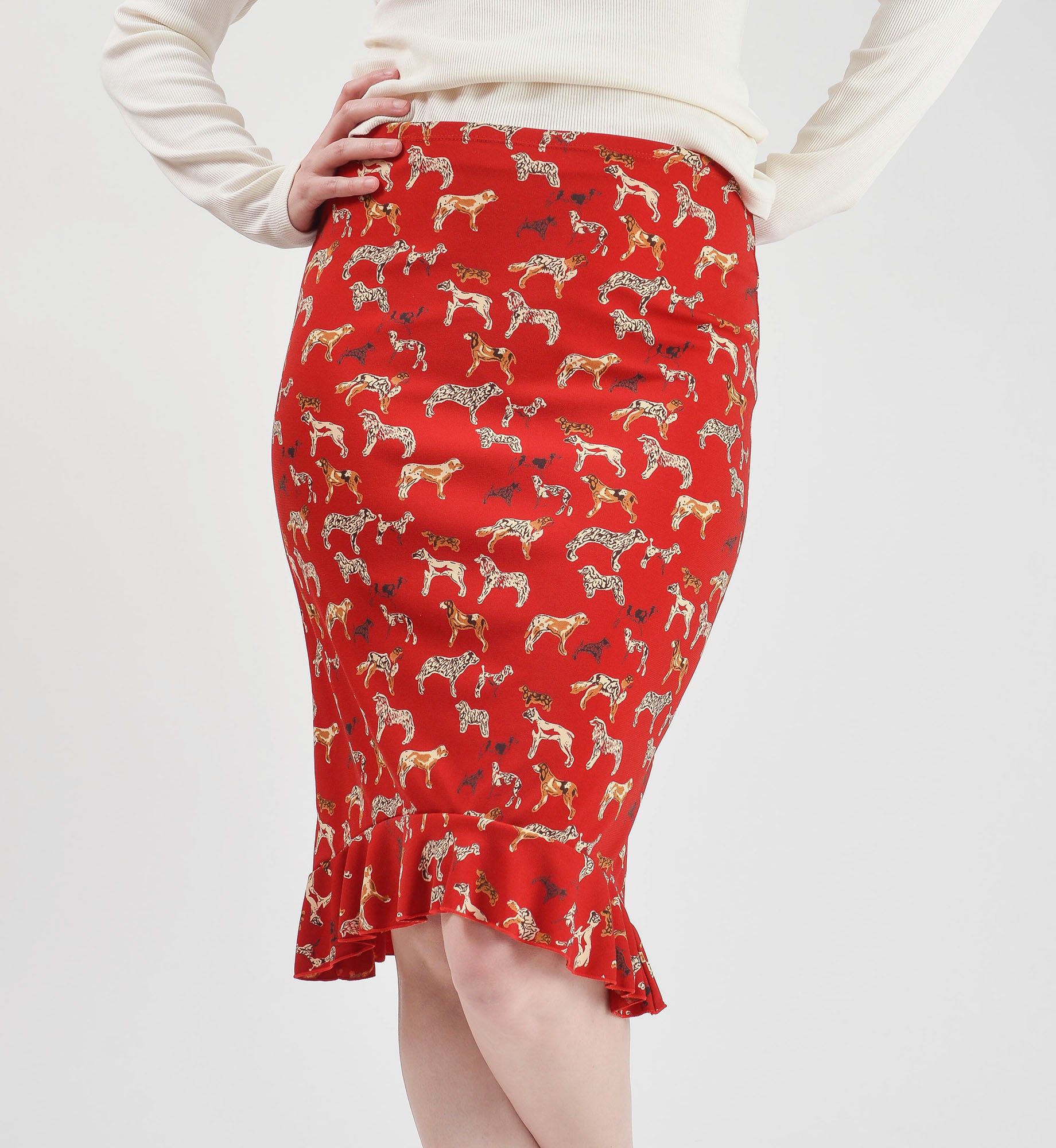 Vintage 1990's - 2000's ESPRIT dark red skirt with cute dog print. Knit fabric with some stretch. Sits lower on the waist. High low hem with ruffle.