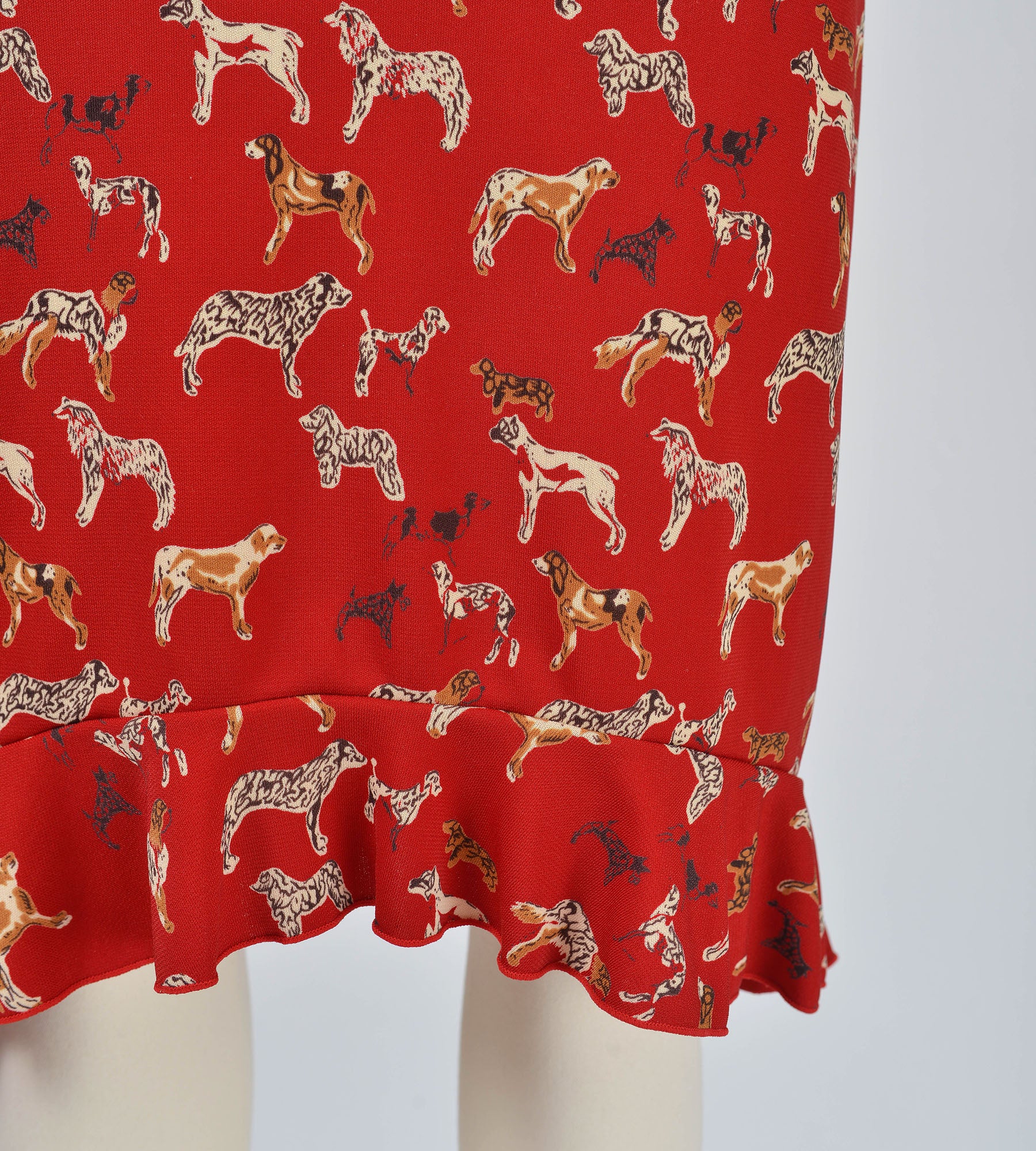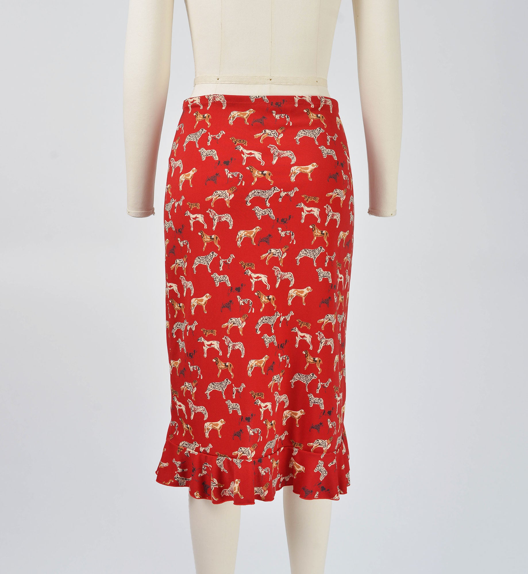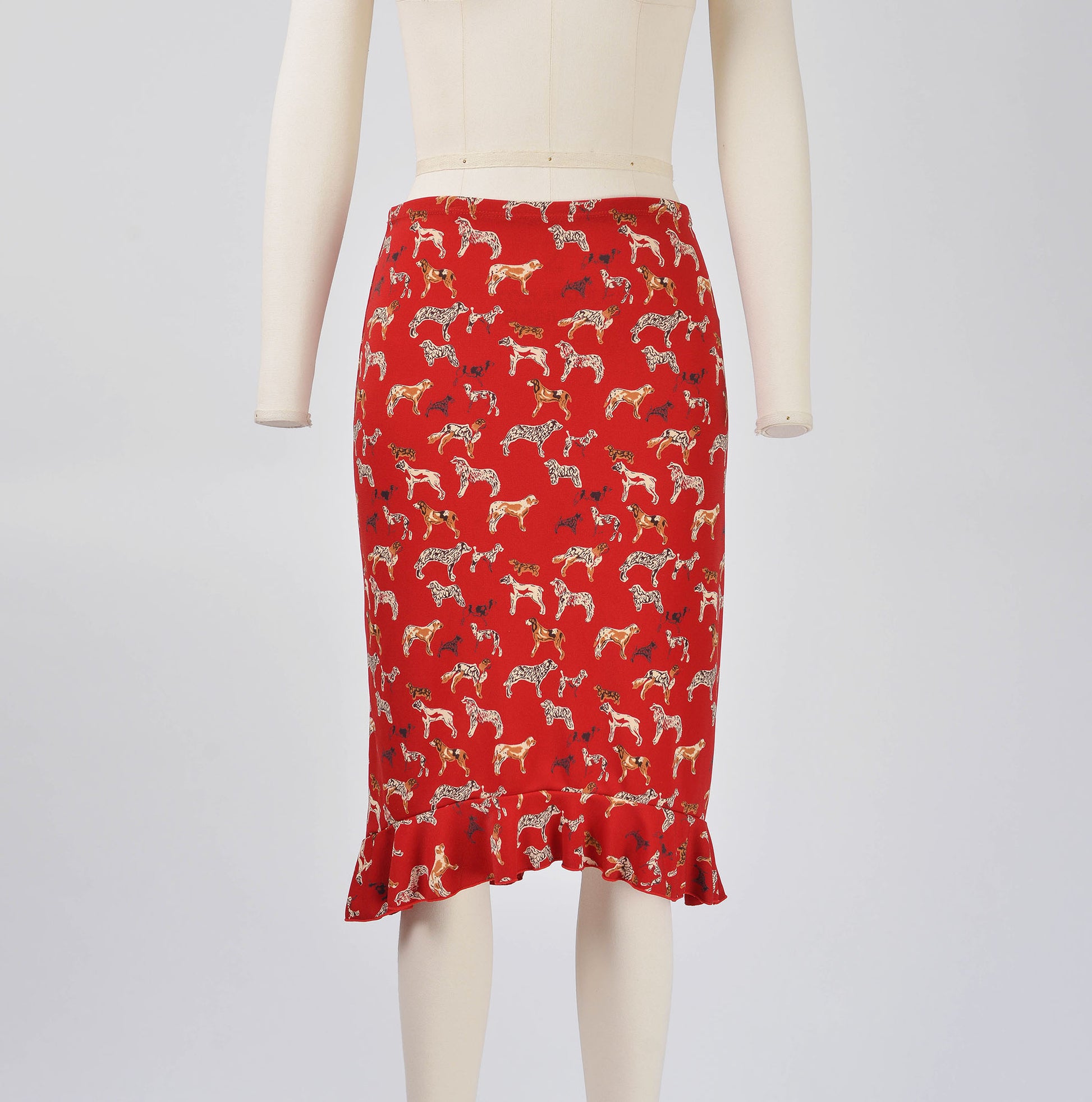 Vintage 90s Y2K Esprit Red Cute Dog Print Stretchy Knit Skirt with Ruffle Hem size XS